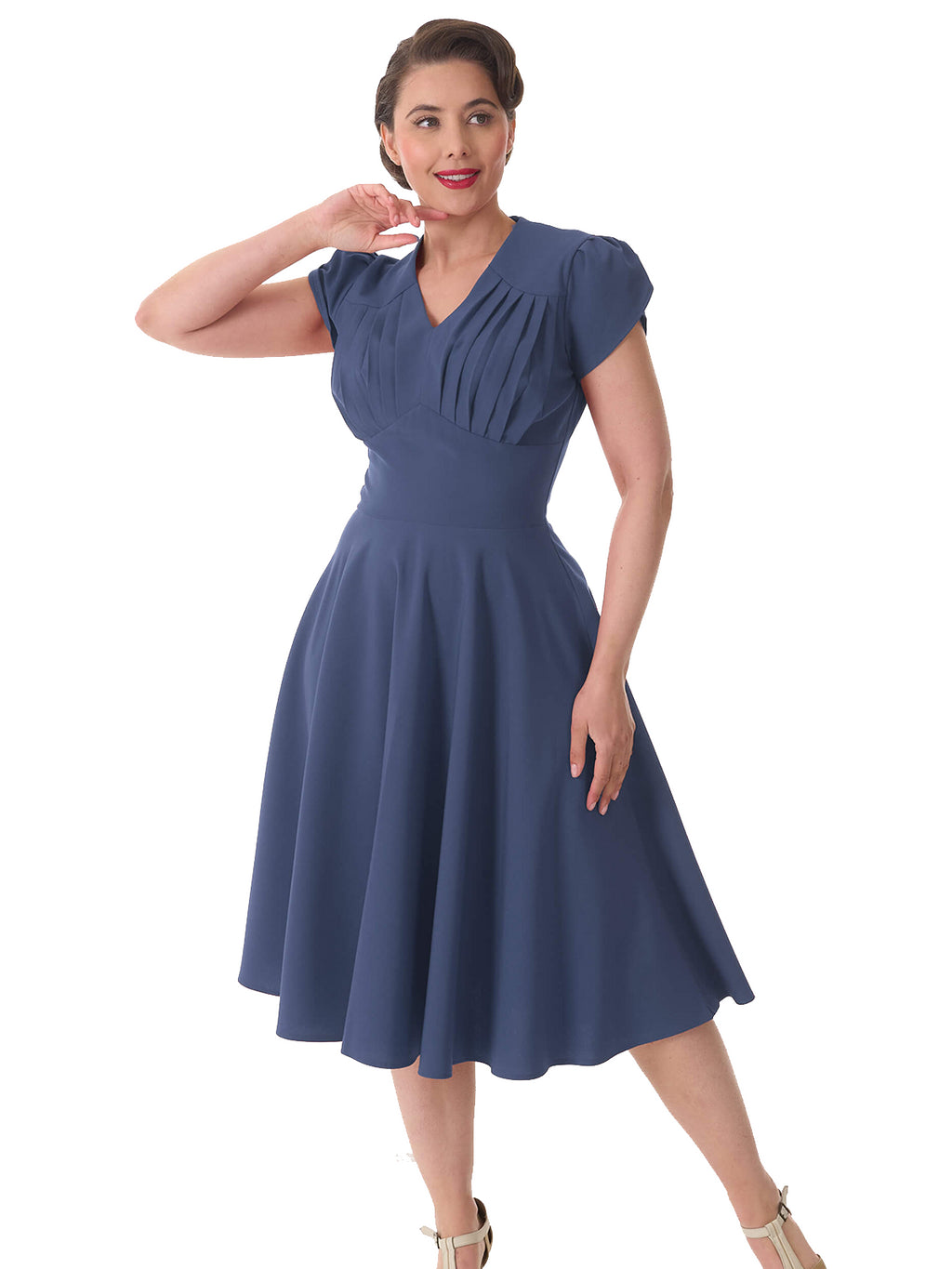 The fit on this dress creates a classic vintage 40s/50s silhouette. Pleated above and below the bust with a waist panel to create a further 'nipped in' look. The 3 quarter full skirt gives a full sweep and petal cap sleeves do not restrict the arms.
