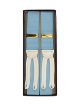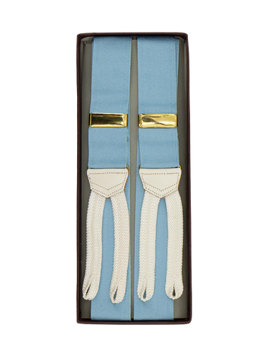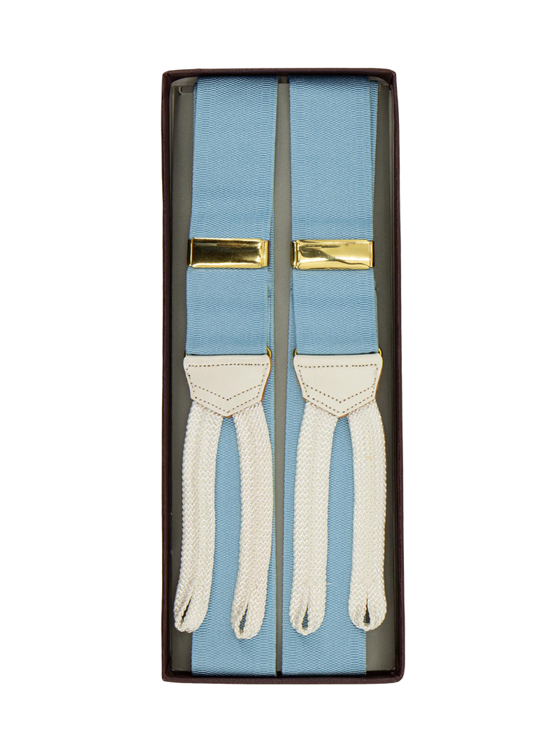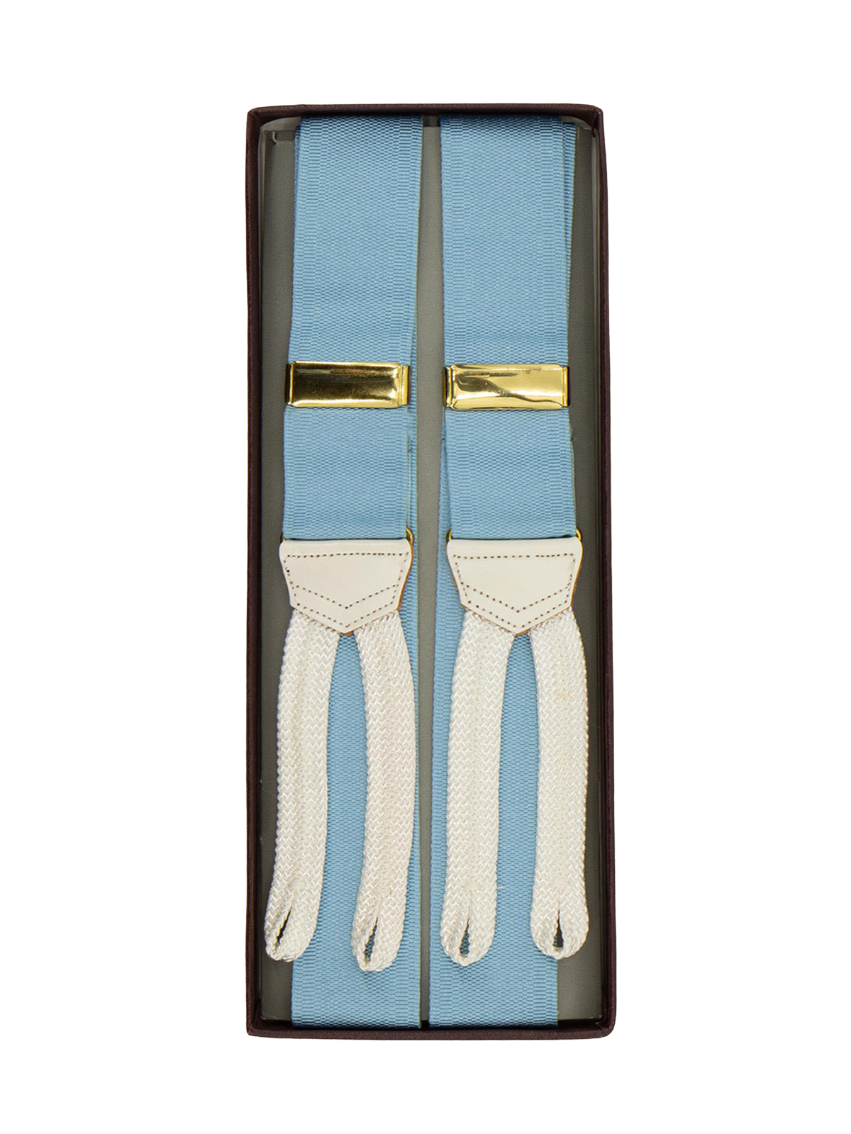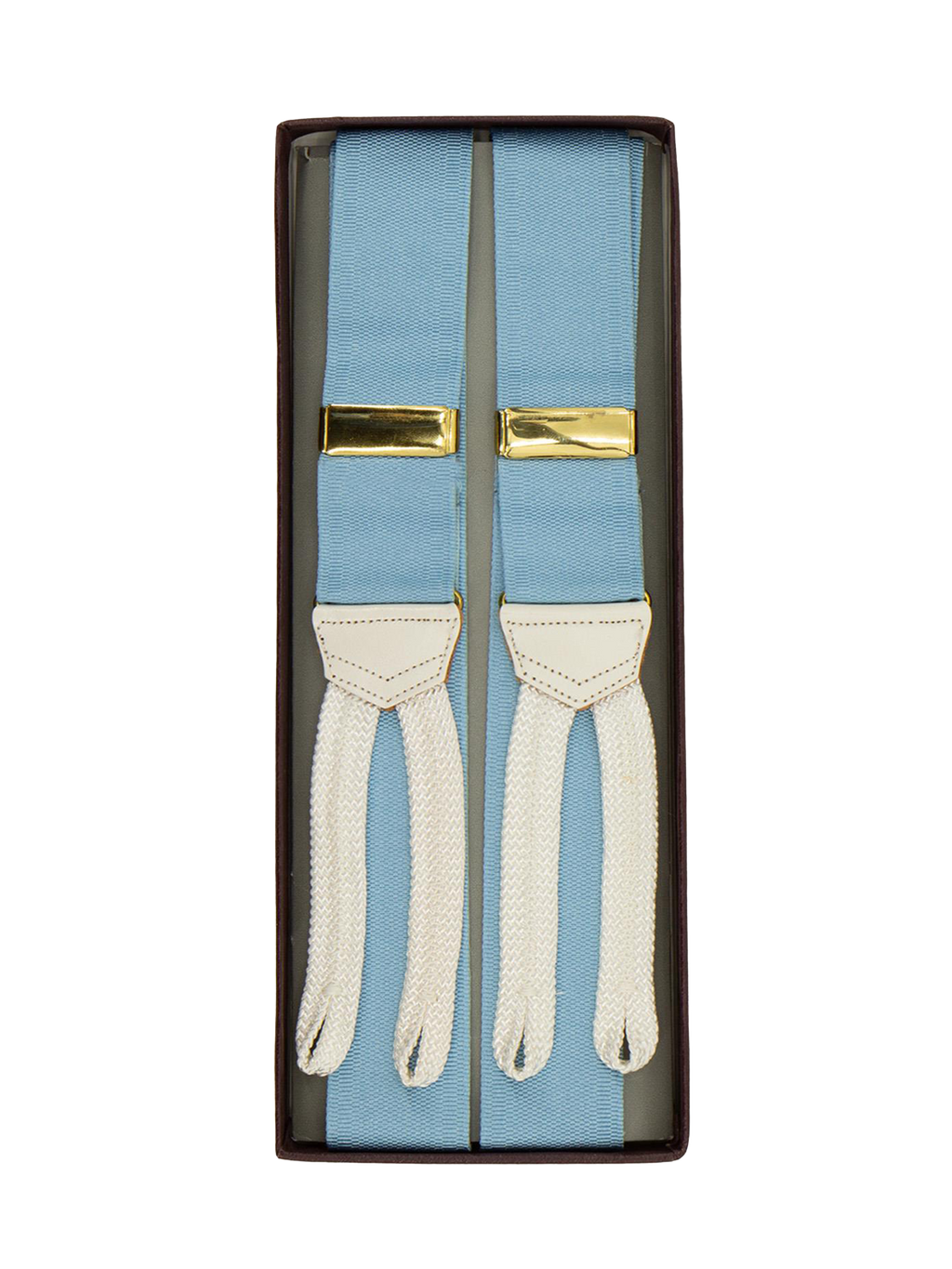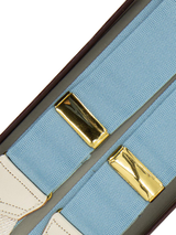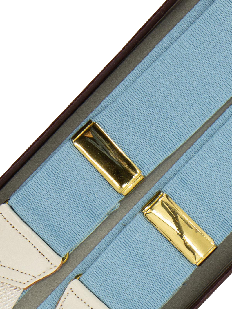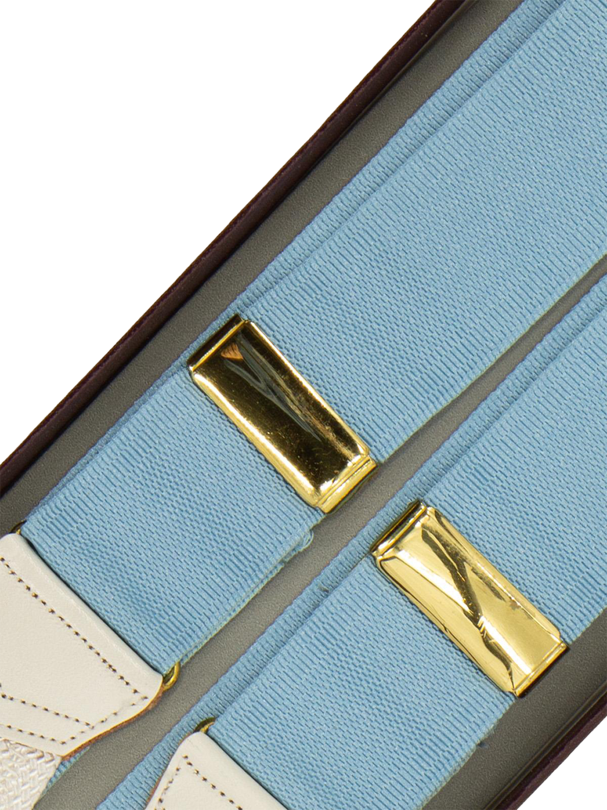 Sky blue woven fabric with leather loops to attach to trousers with waist buttons.