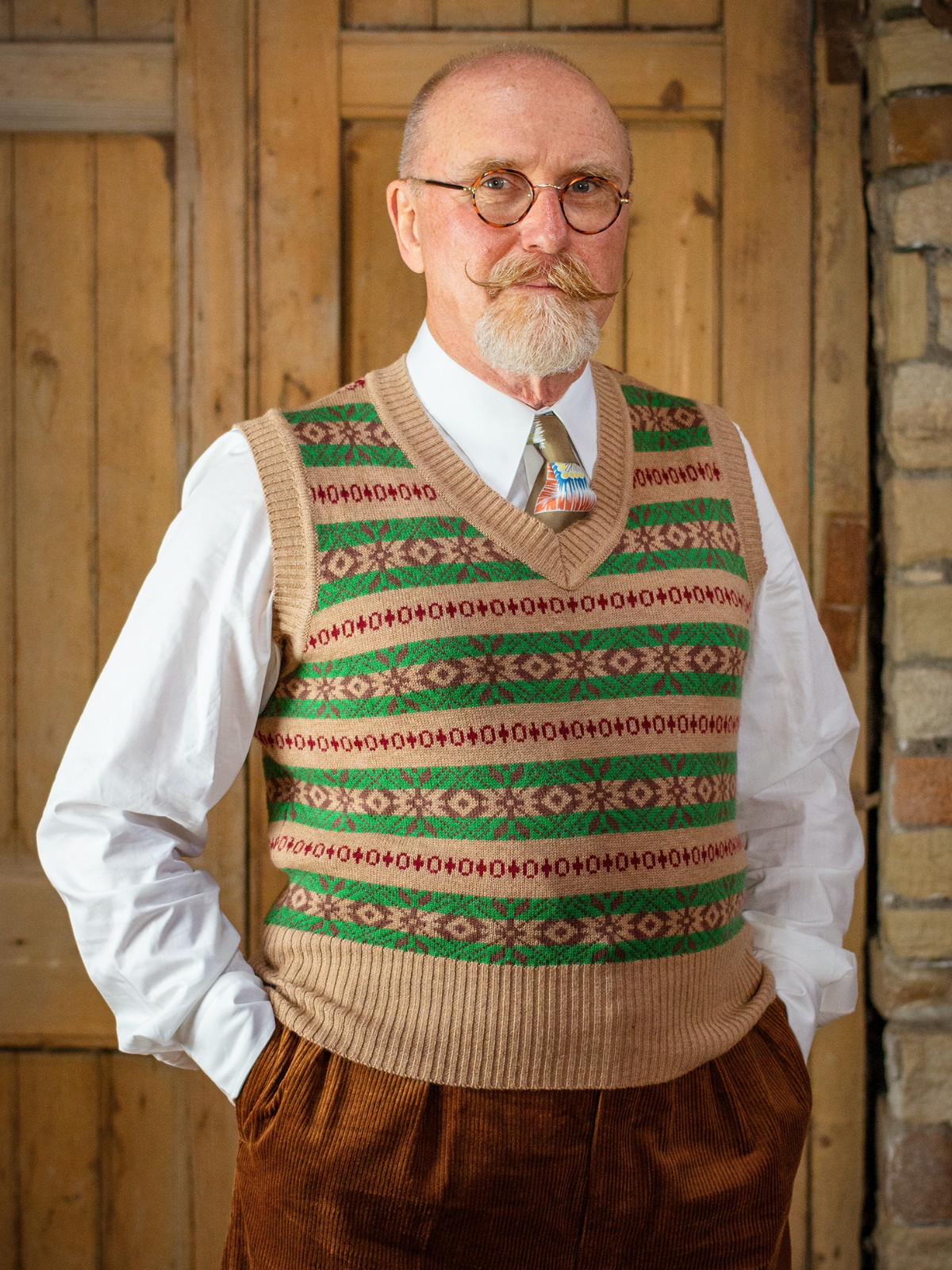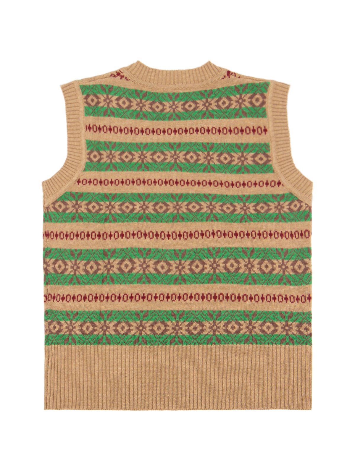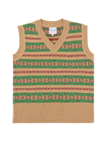 The Arthur knitted tank top is a 1940s inspired piece that blends practicality with style. Its light brown and green palette brings warm autumnal tones to your outfit, while the red and brown accents add a touch of vibrancy, perfect for brightening up cold-weather days.