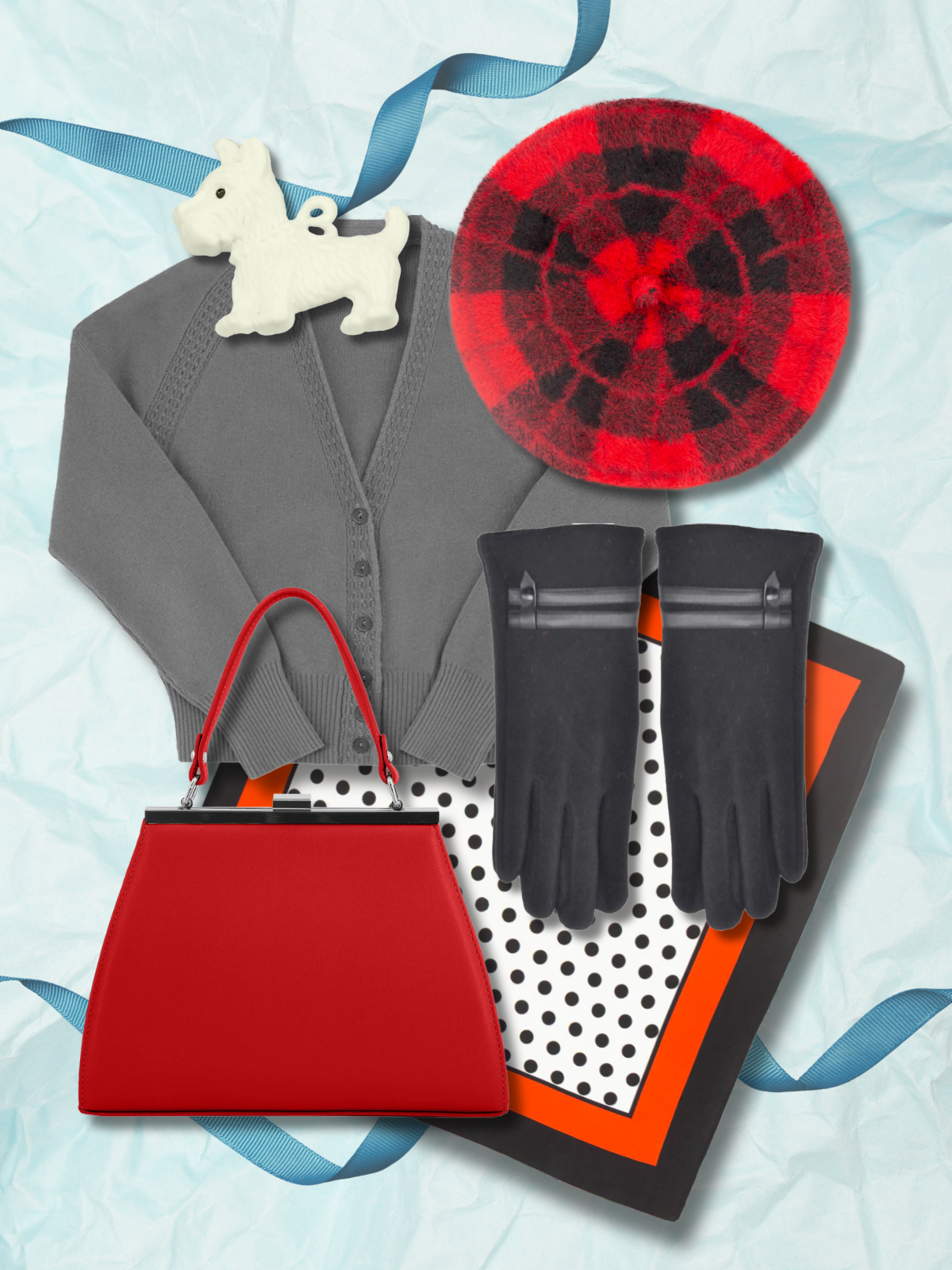 Thoughtfully selected for charm, quality, and style, this set includes our Daydream cardigan in poodle, the Yesteryear handbag in bright red, a pure wool beret in red tartan, leather detail winter gloves in black, a silk polka dot scarf in black and red and a scotty dog brooch.