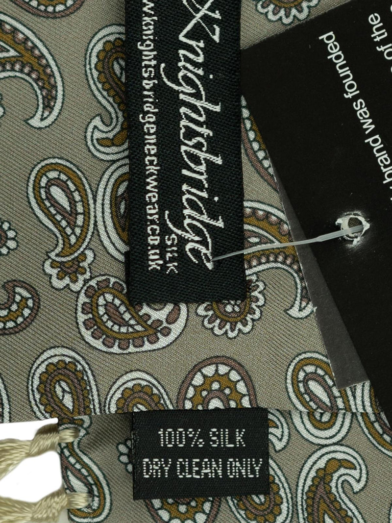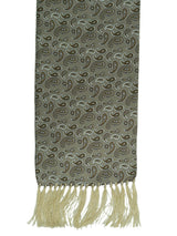 Beige paisley print pure silk aviator scarf with cream silk tassle fringing.  A classic gent's accessory throughout the decades in a perfect neutral colourway to coordinate perfectly and effortlessly with your ensemble.