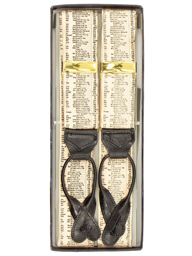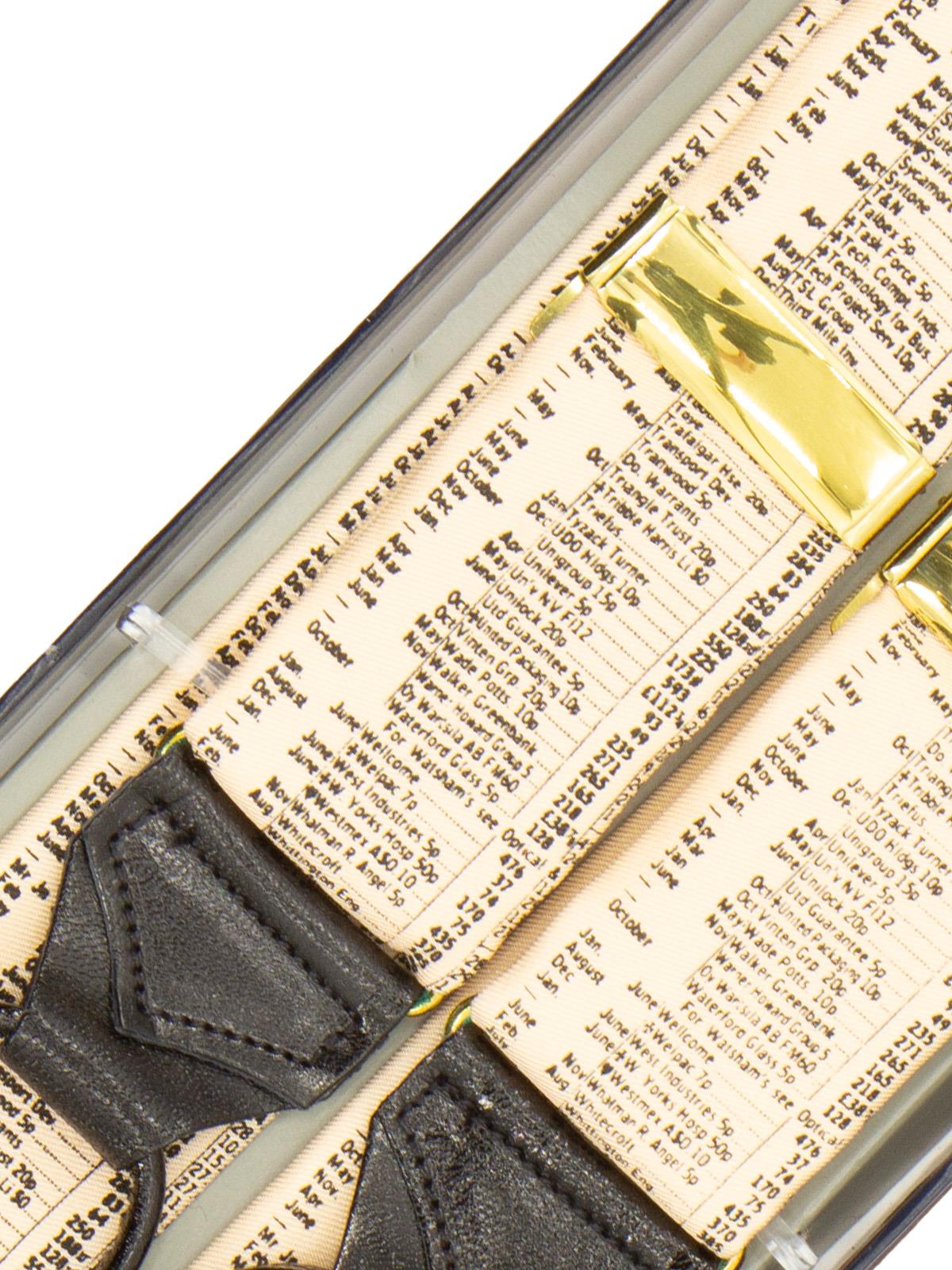 Script on a beige background with leather loops to attach to trousers with waist buttons.
