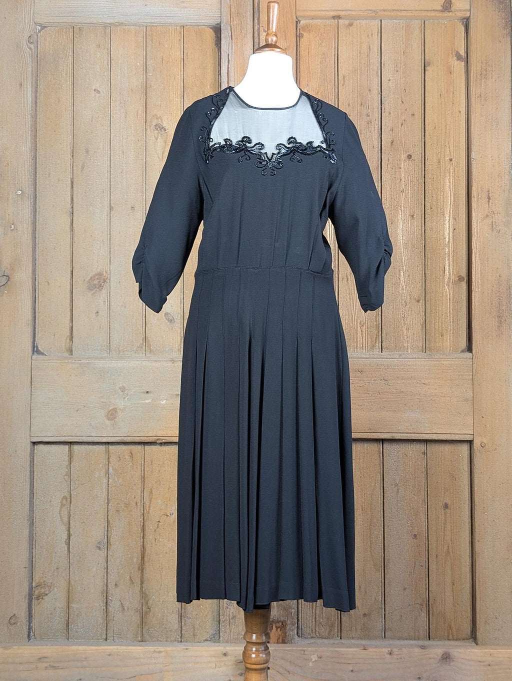 An elegant original forties occasion dress, with a sheer panel at the top of the bodice that is decorated with beautifully shaped beading. Made of a classic black crepe, with gathered half length sleeves and a pleated skirt.
