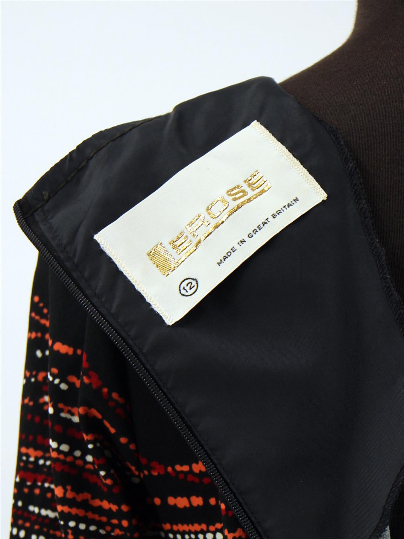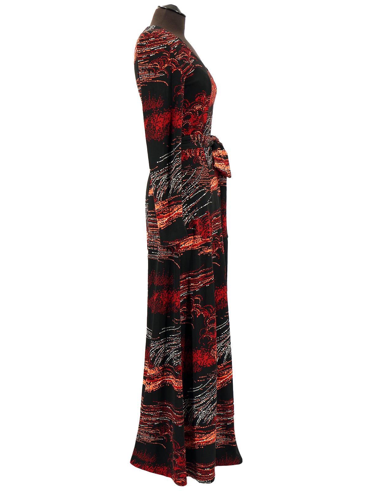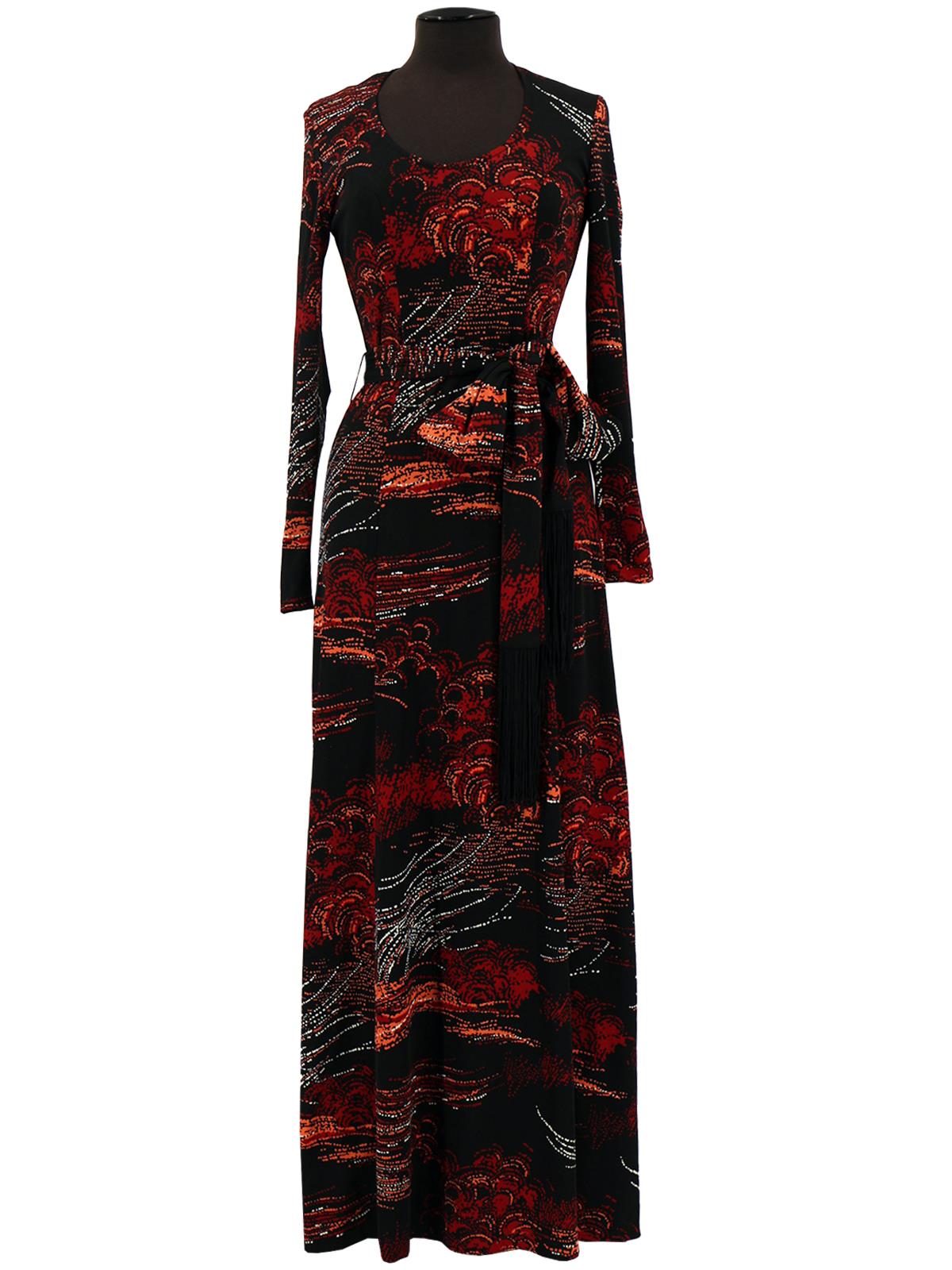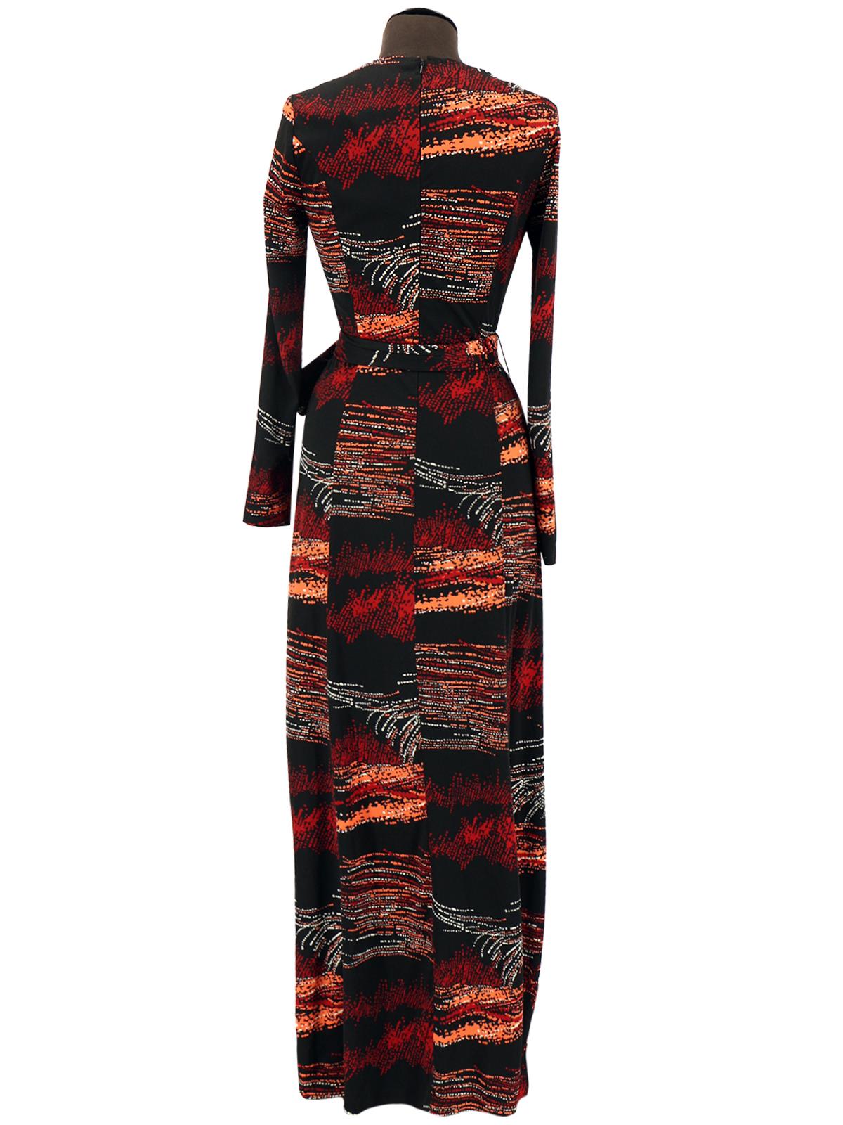 A unique 1970s maxi dress with an abstract red, white and orange pointillism pattern. The dress has a scoop neck, long sleeves, and a matching fabric belt.