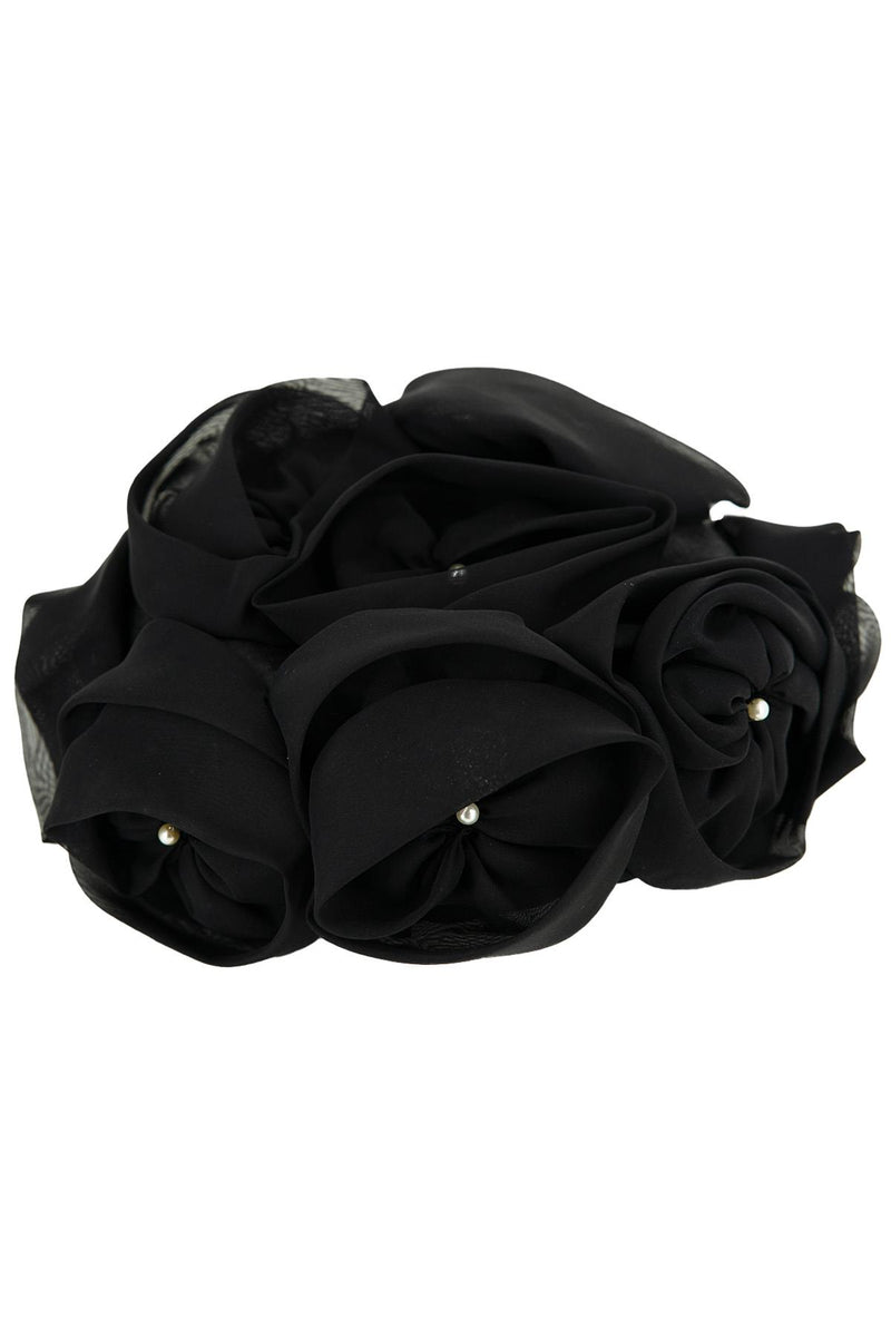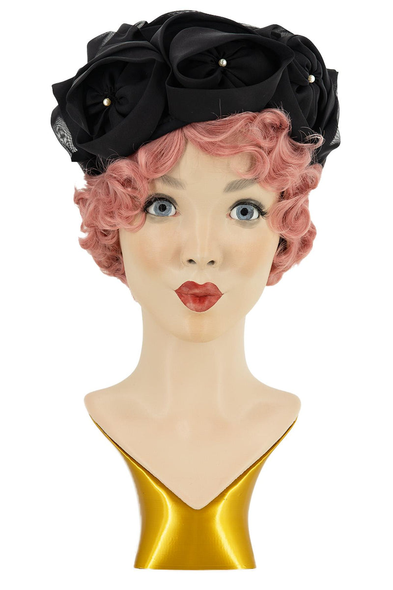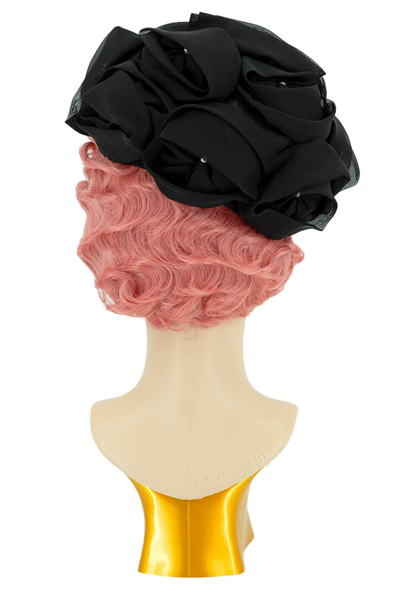 A black vintage 1960s bouffant hat, decorated with pearl details at the centre of each ruched fabric flower. Fully lined, with no label present. A textured statement piece to add true 60s style to any vintage outfit.