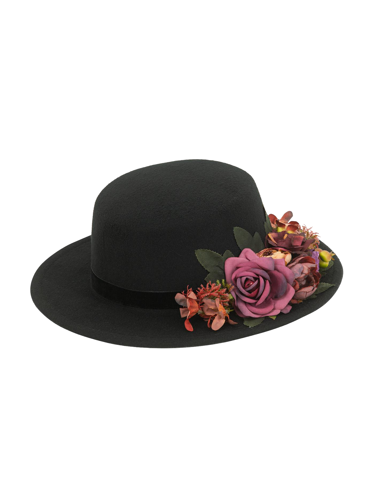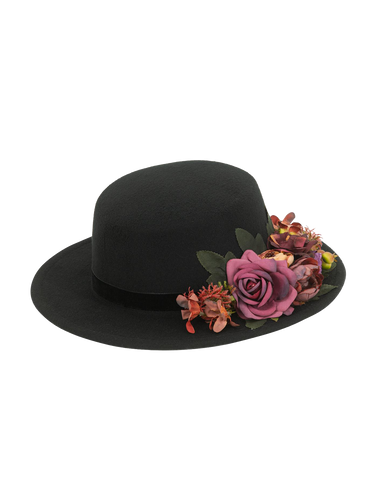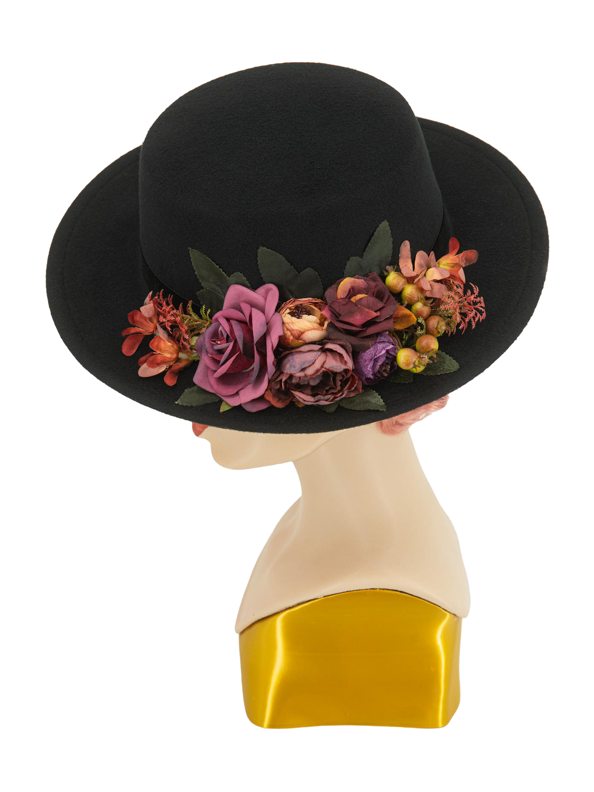 A large retro style boater hat crafted in quality black wool felt. Trimmed with a coordinating seasonal posy of flowers to one side. The water resistant finish adds practicality and durability, while the inside drawstring ribbons make it adjustable for a comfortable fit.