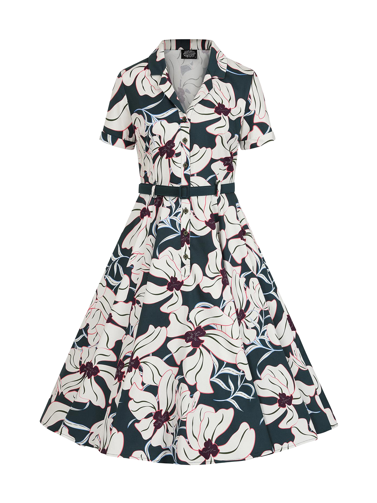 This sophisticated swing dress features a bold white floral design on a contrasting black background. Made from a stretchy cotton blend, this dress flatters the figure, creating a perfect silhouette. Its elegance is partnered with modern practicality such as hidden seam pockets, matching belt and belt loops. The perfect choice for a sunny day out or garden party.