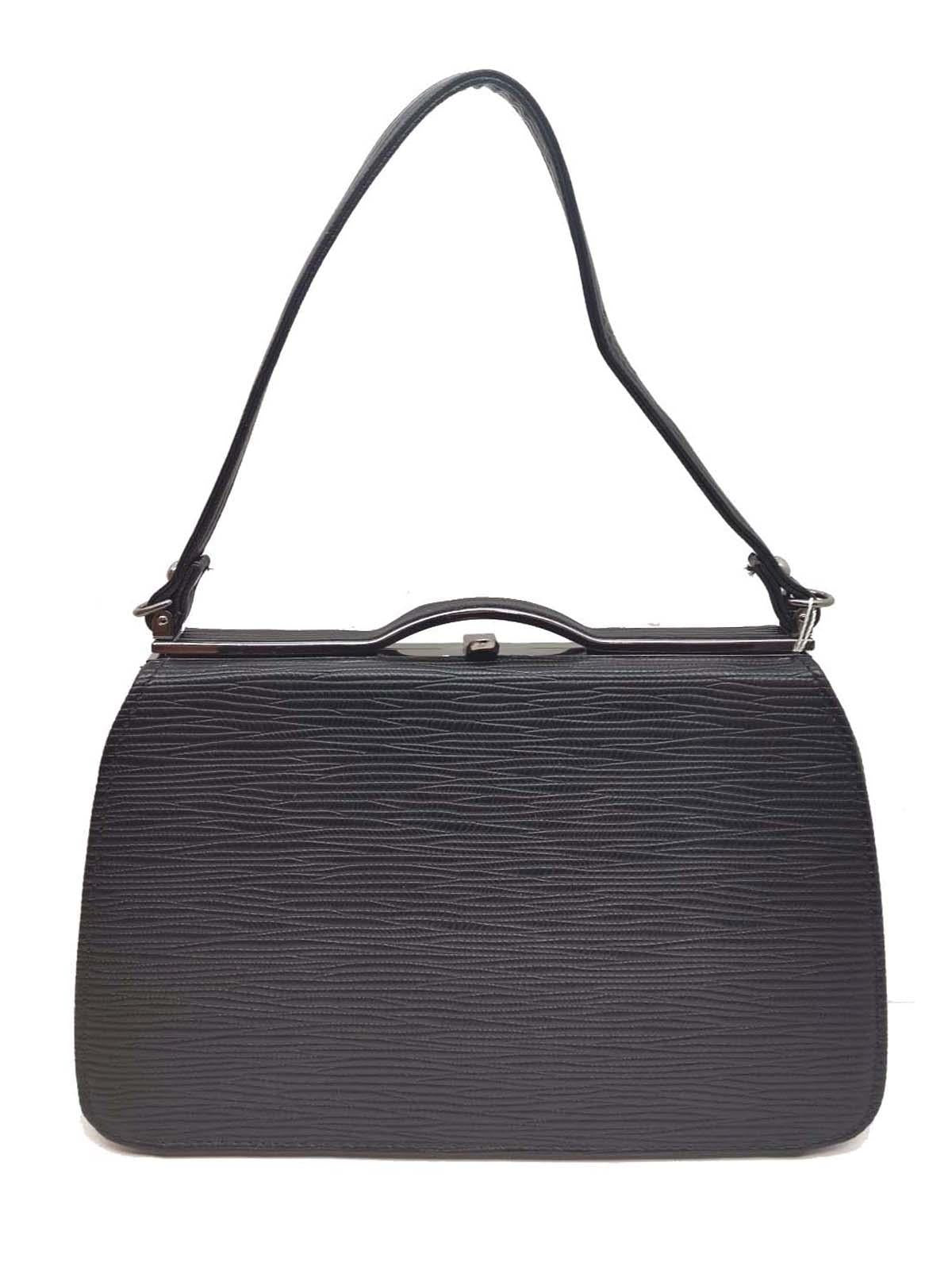 Matt black textured vinyl makes up the body of the bag with a single top handle, the bag also has a detachable long narrow clip-on shoulder strap for versatility.