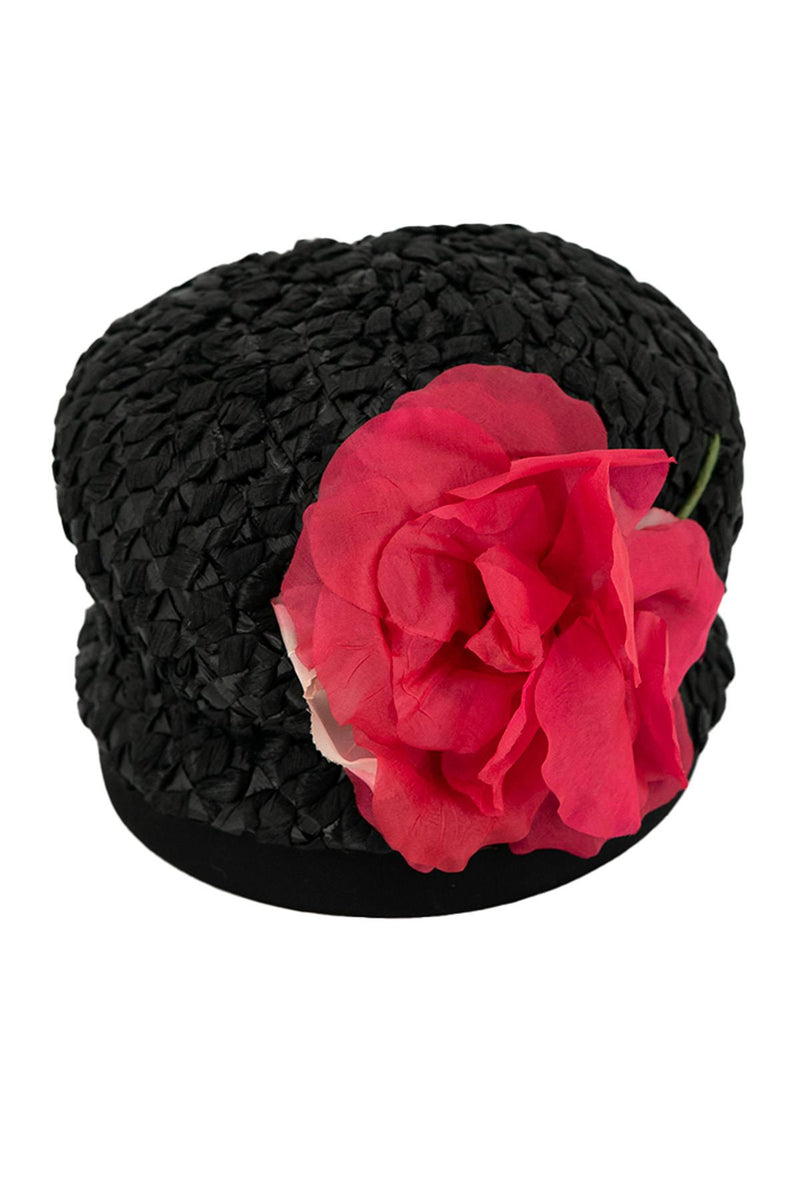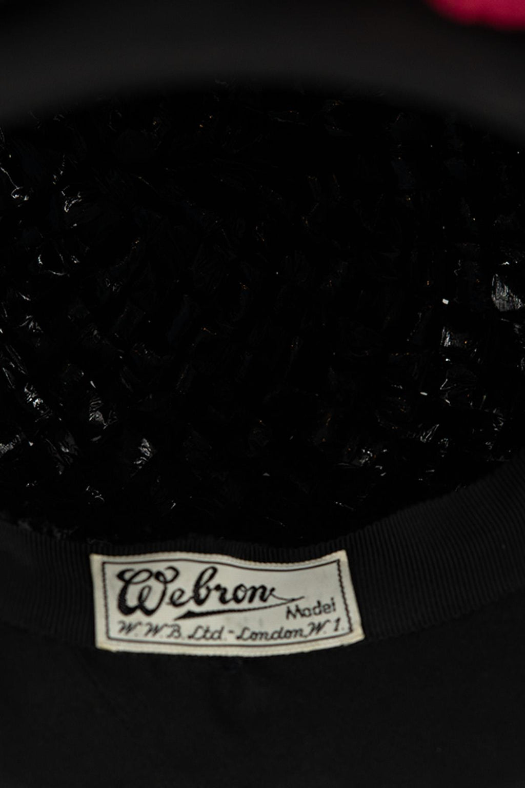 A genuine 1960s dome style hat made from black raffia, decorated with a bold fuchsia rose embellishment. Made by Webron of London, this striking piece adds instant authenticity to any sixties outfit.