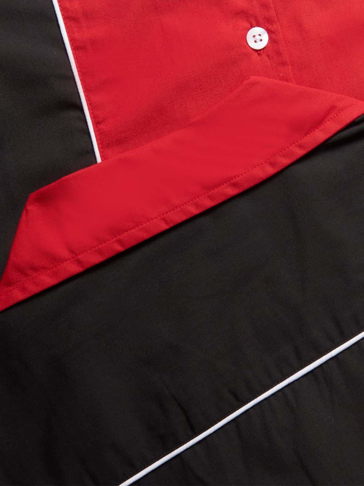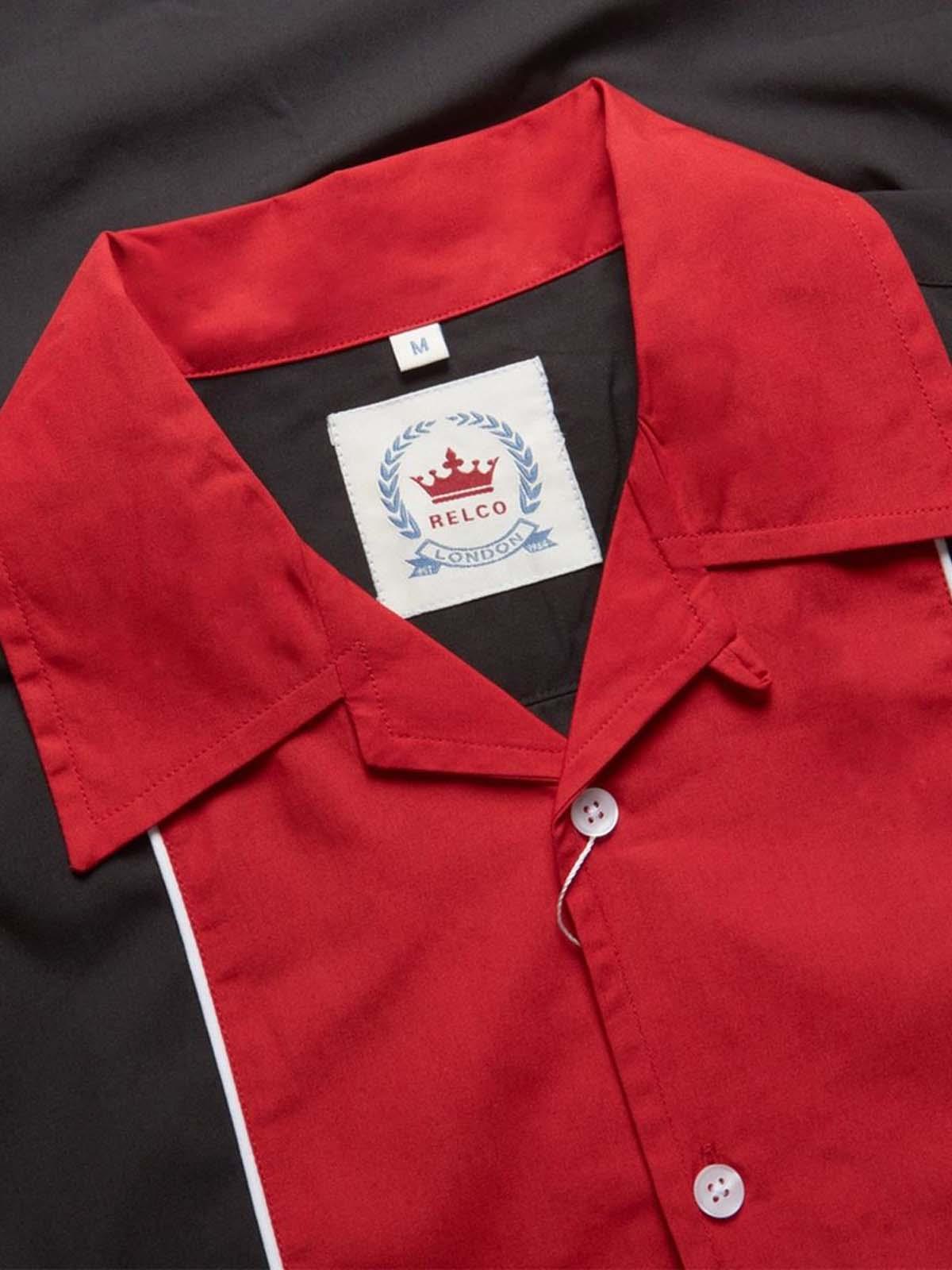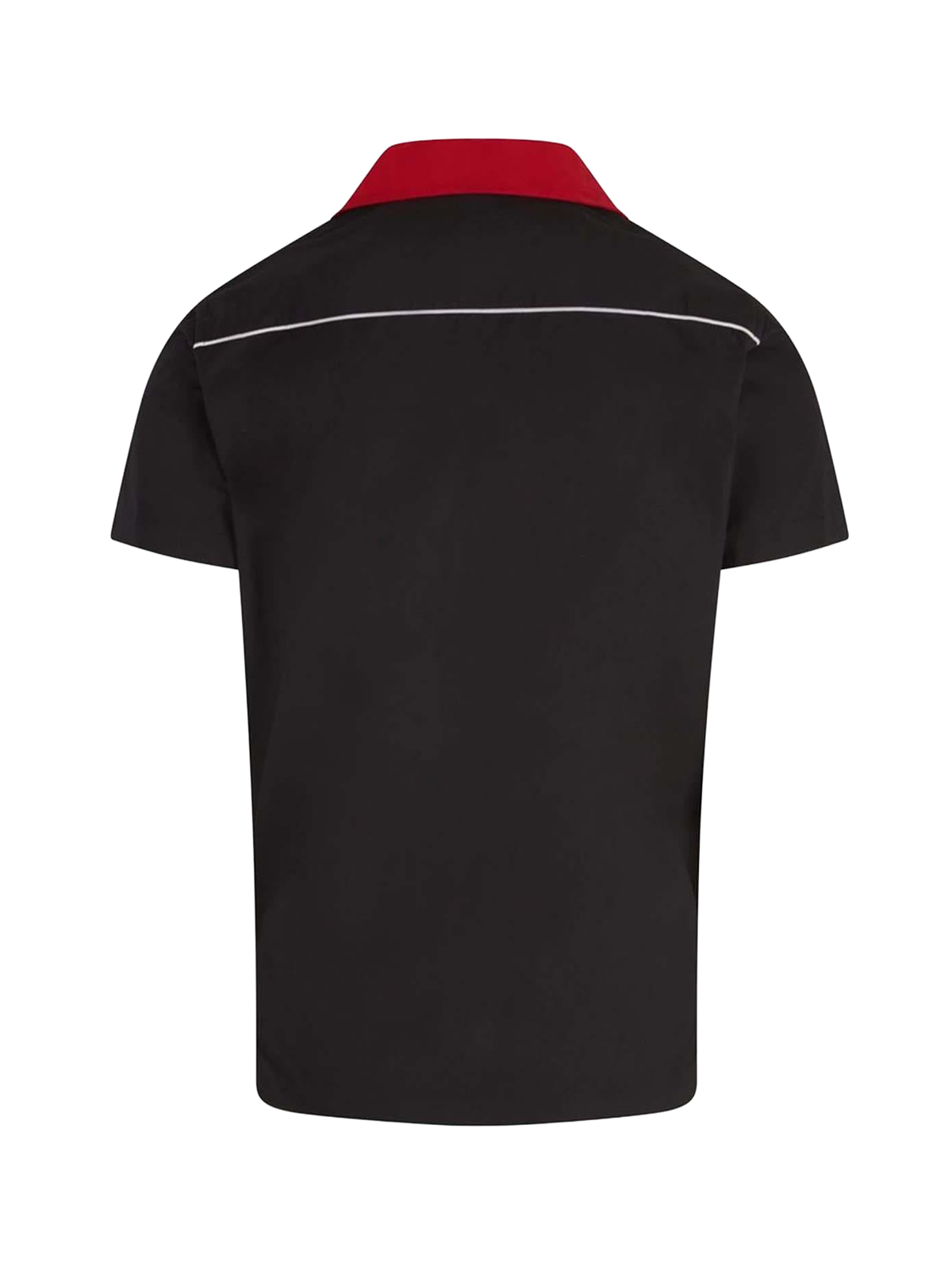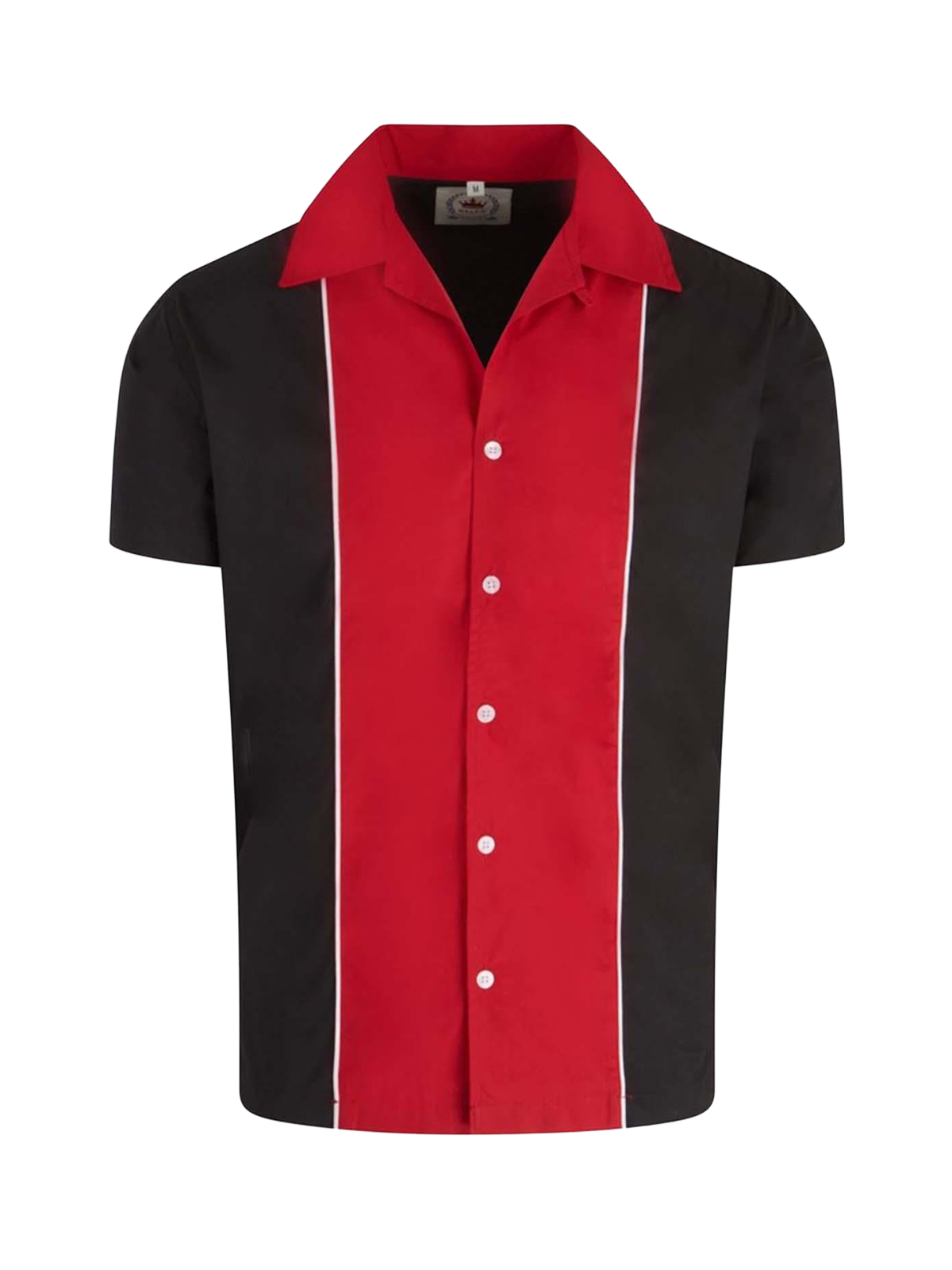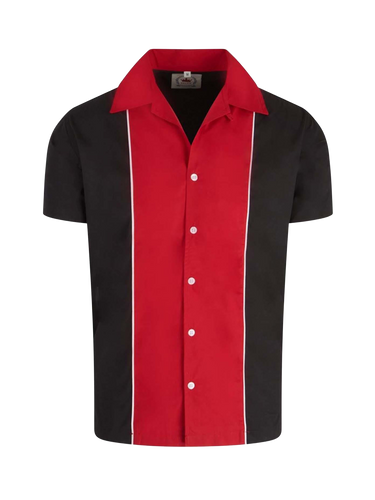 Classic 1950s-style black bowling shirt with retro characte. Featuring a contrast red centre panel and collar, it brings effortless vintage cool to casual outfits.