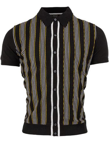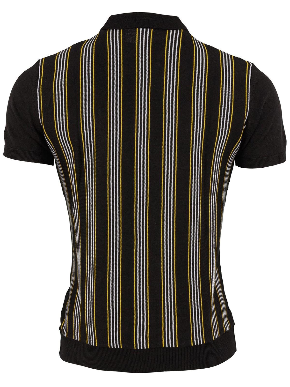 Mod style men's knit top, with a yellow and white stripe and a classic polo collar. Classic black colour.