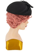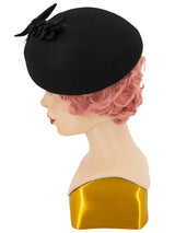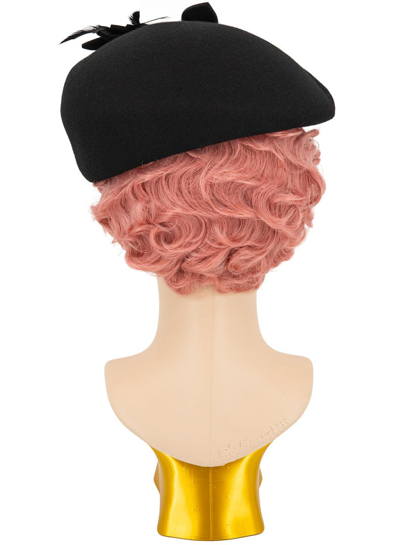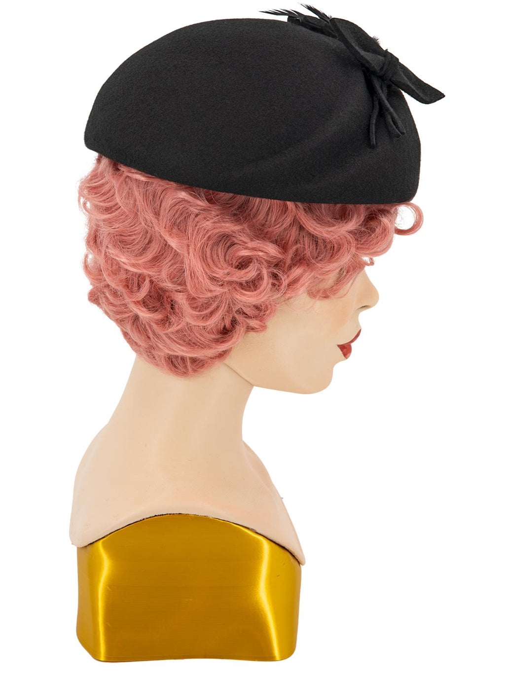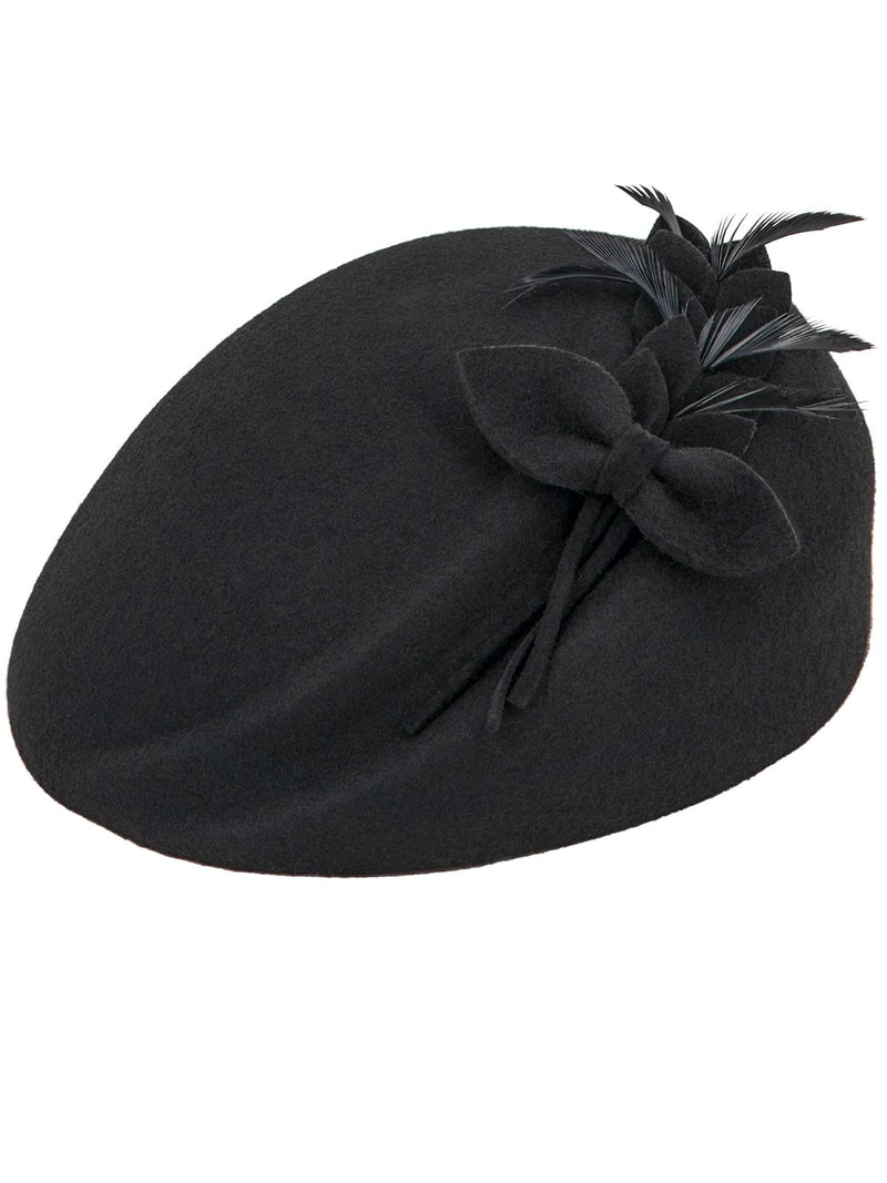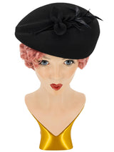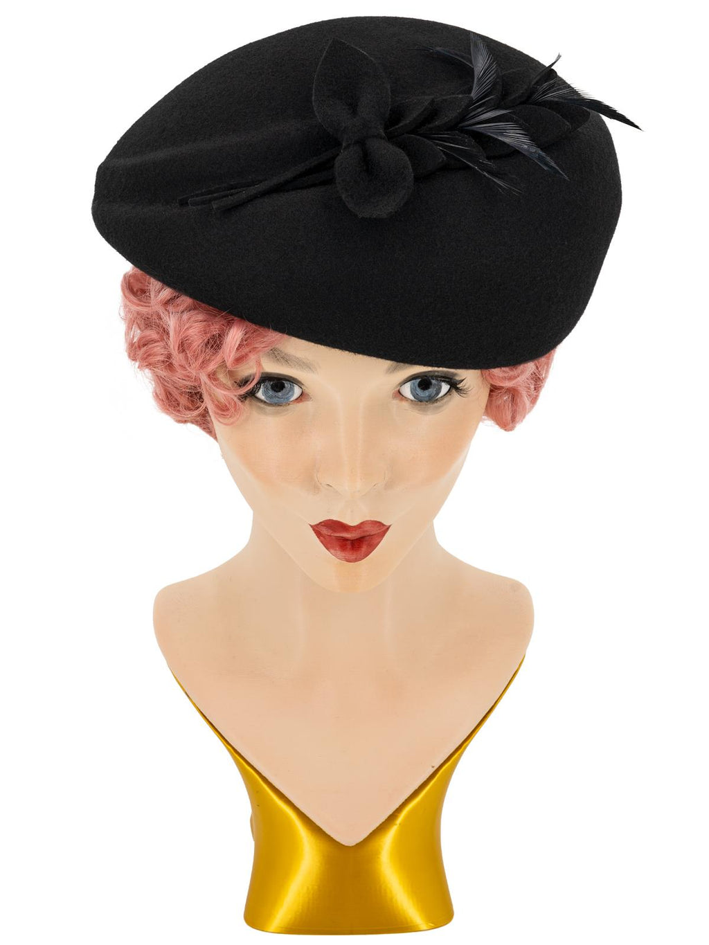 A handmade vintage style cloche hat in deep black wool, featuring an asymmetrical felt petal design with small decorative feathers. Made from 100% wool with a water resistant finish. Can be worn straight or at an angle for extra vintage flair. Fitted with two hair combs and an adjustable hatband inside to ensure a secure, comfortable fit.
