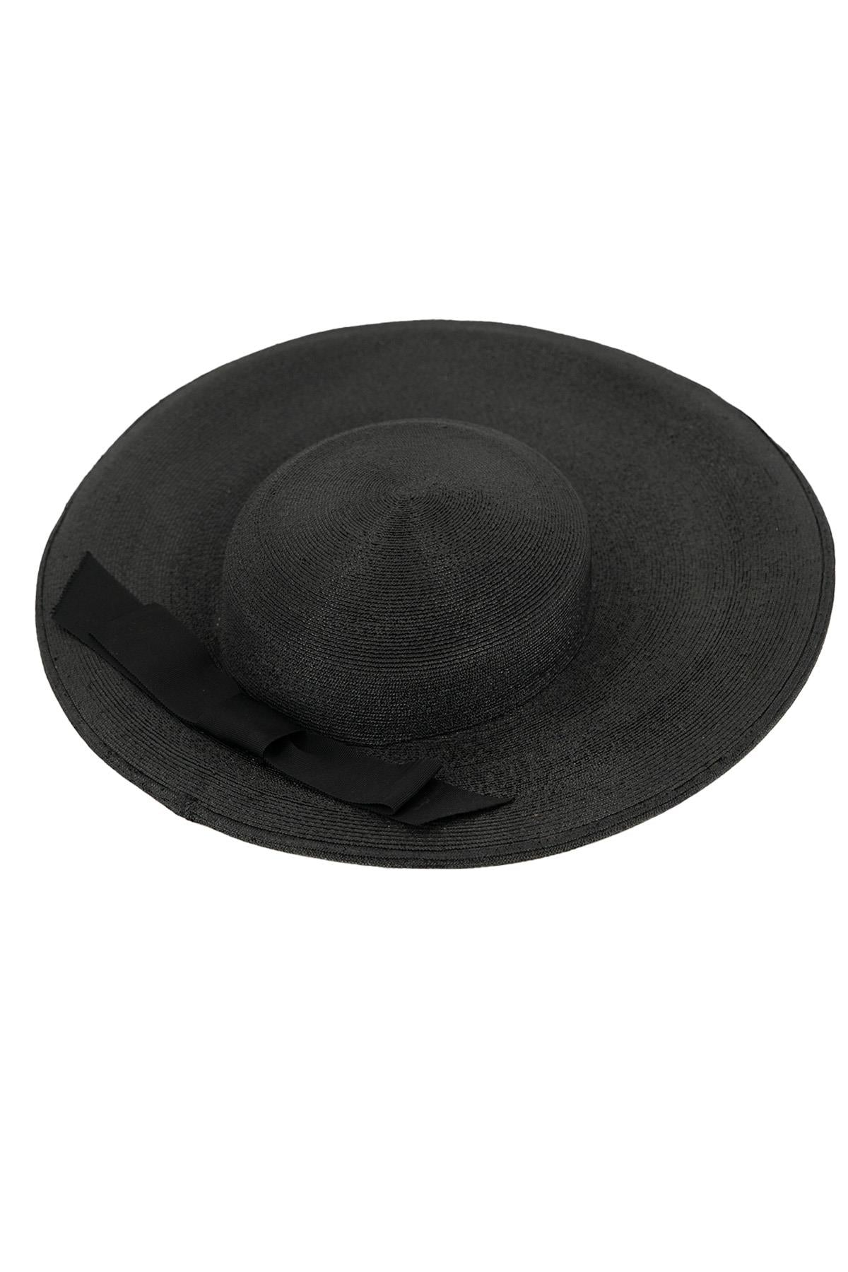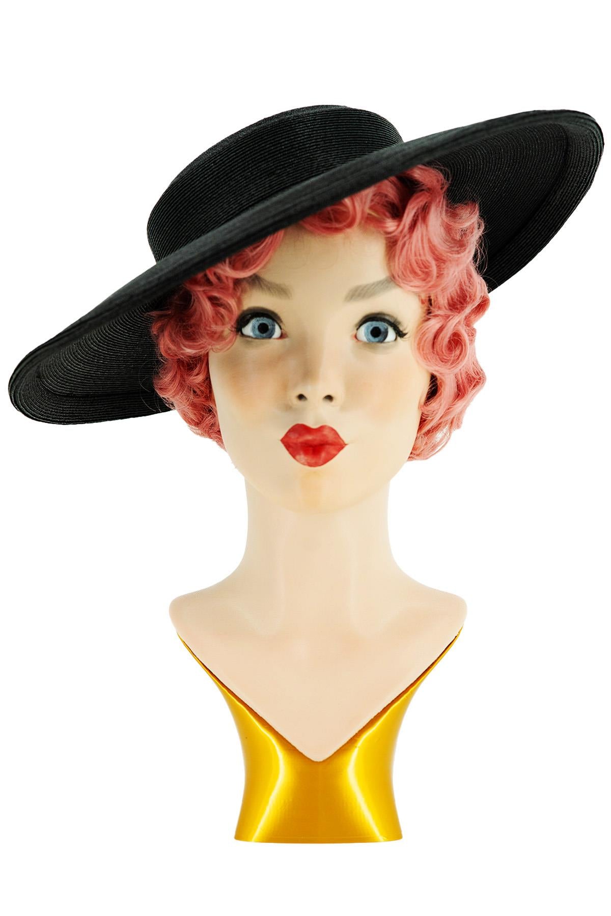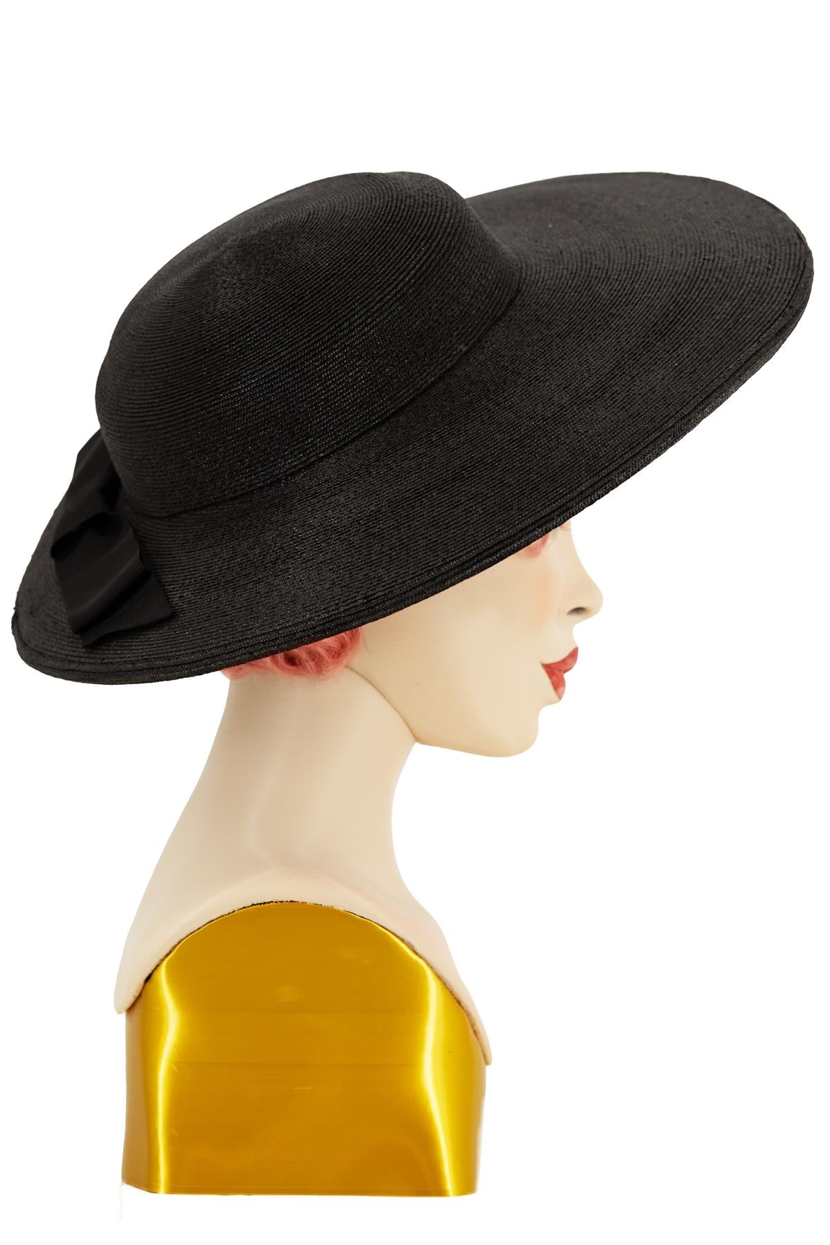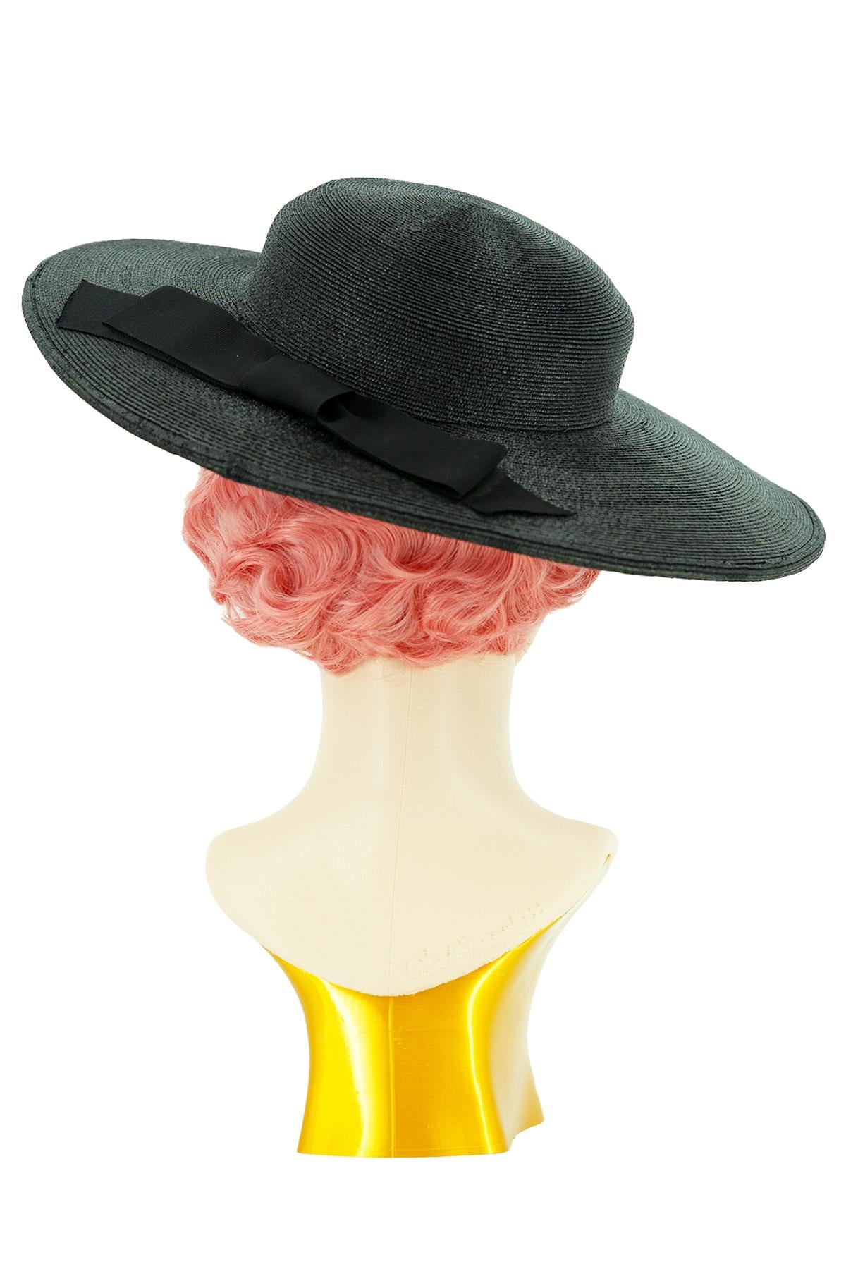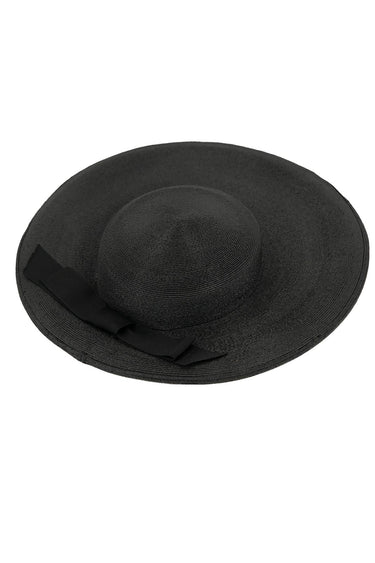 A black woven 1950s saucer shape hat with grosgrain bow detail.