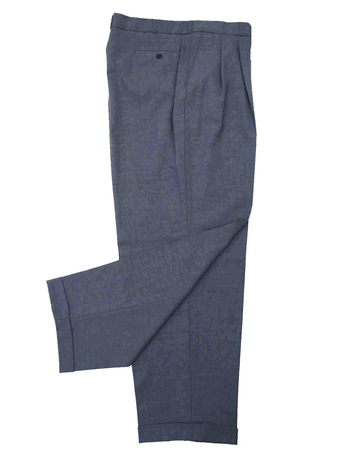 The matching trousers have double pleated fronts and turn-up cuffed hems.
