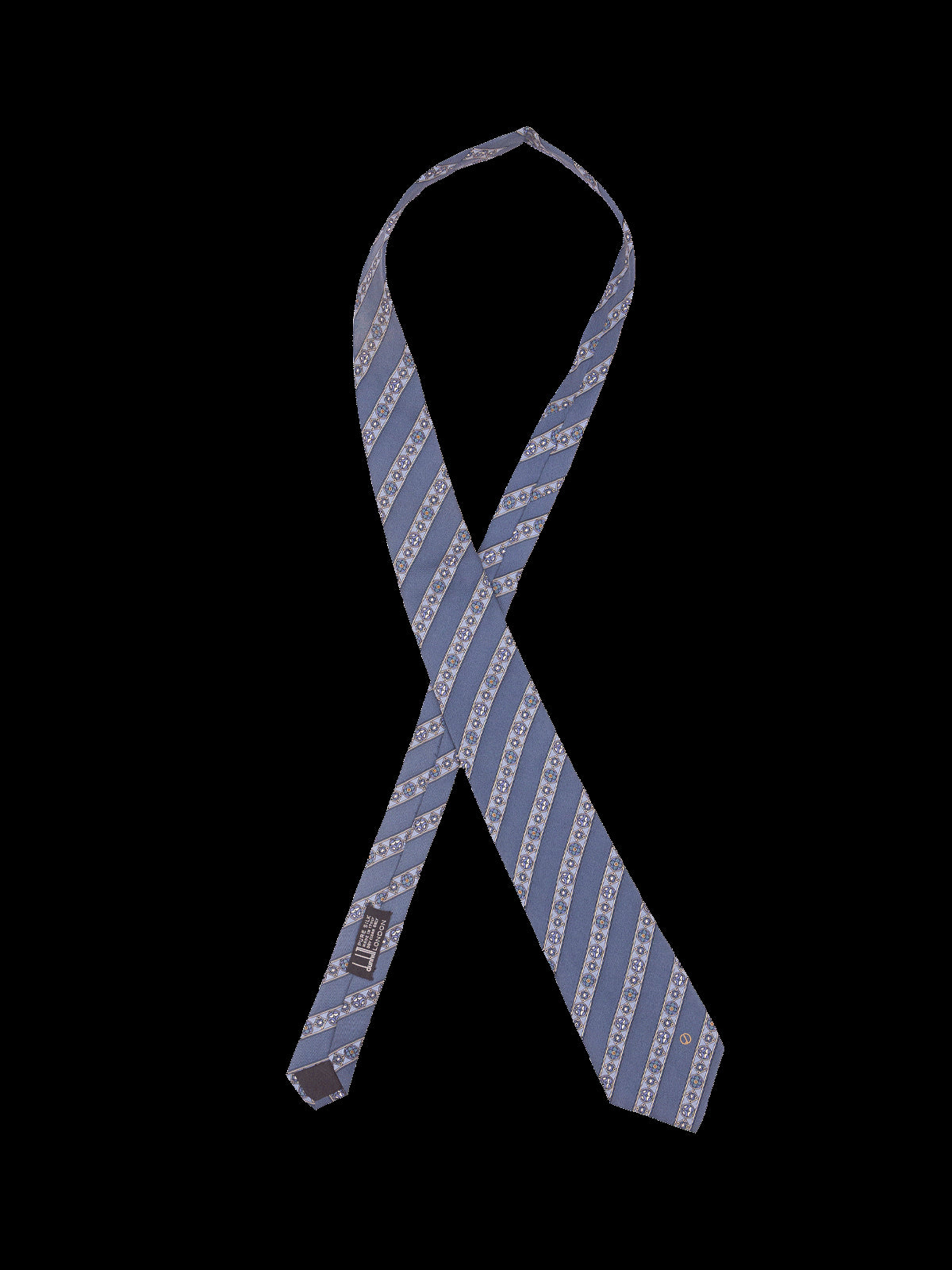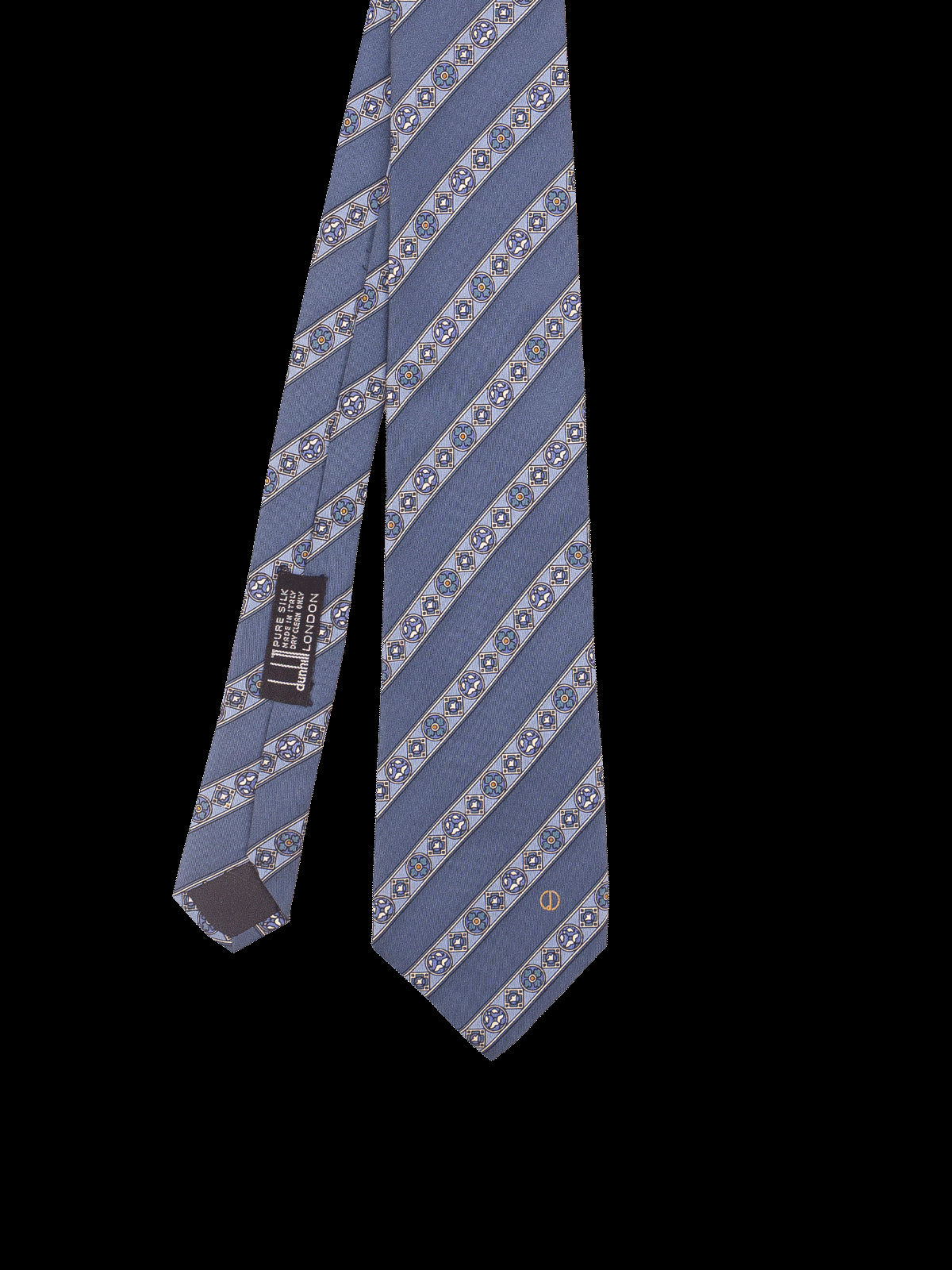 A designer tie with the quality you would expect from Dunhill London label. Highest quality silk in a rich finish. Featuring an eye catching linear stripe design with intricate medallion repeat patterns in tonal greys, blues, and cream/gold. A timeless accessory to add interest to spearpoint collar shirt.