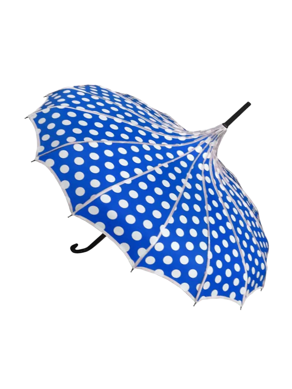 Timeless blue polka dot pattern pagoda vintage look umbrella. Protect your vintage outfits in inclement weather with a perfectly complementary accessory.