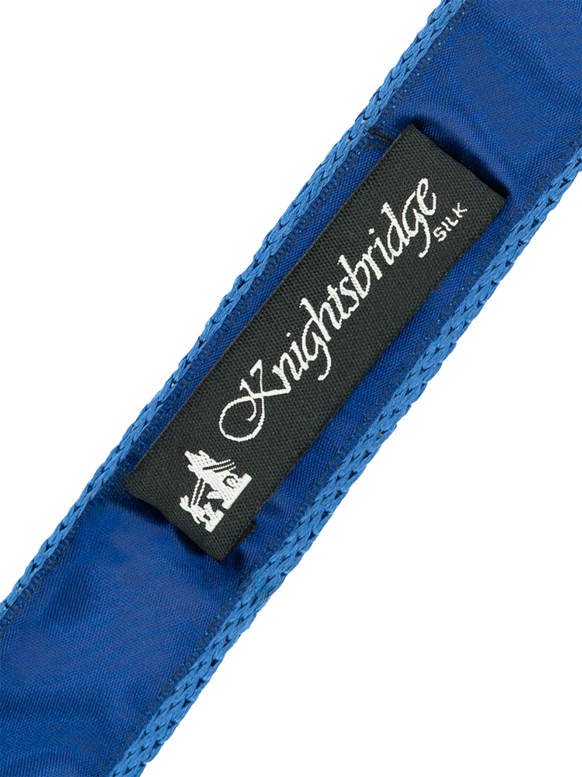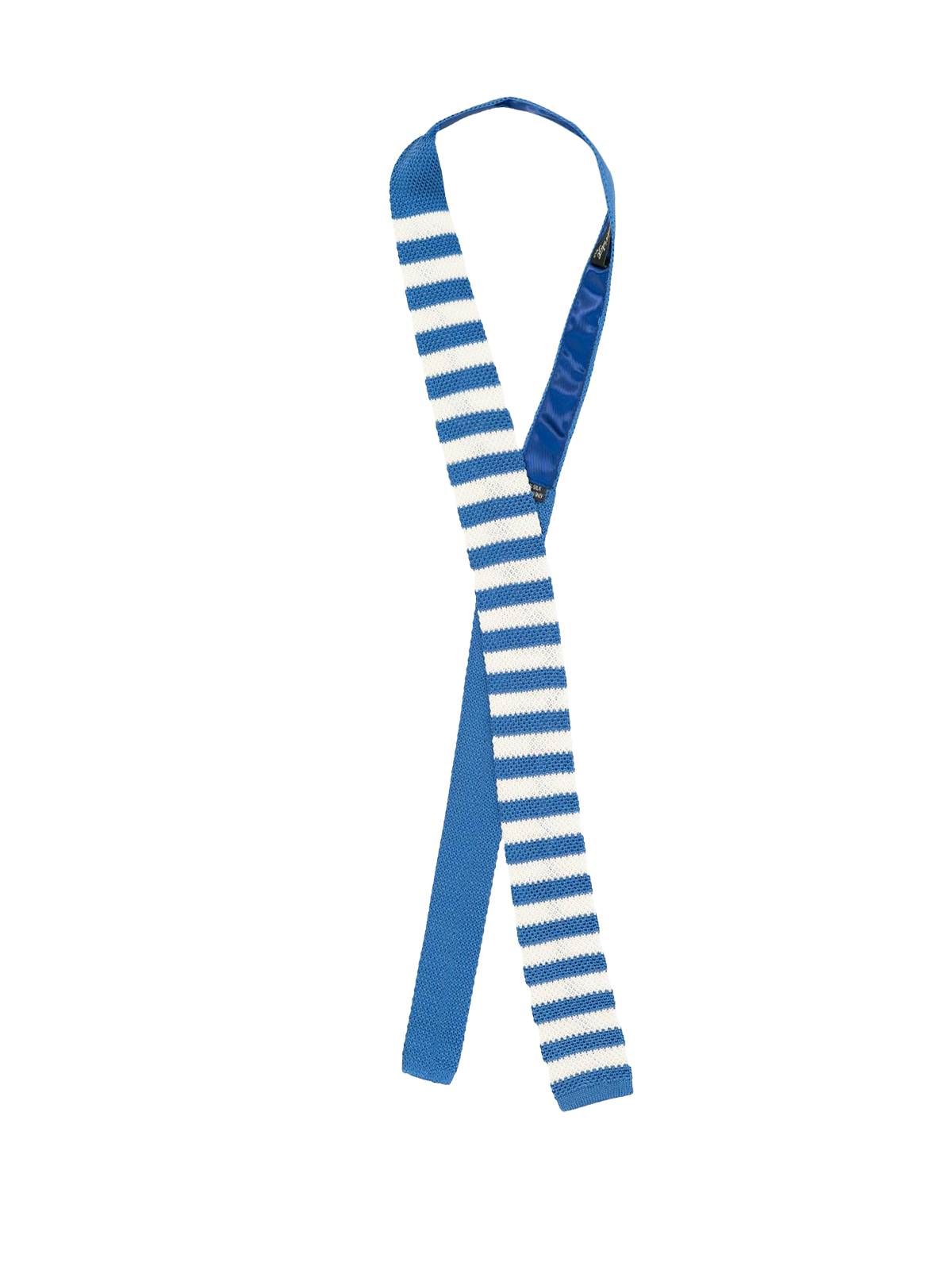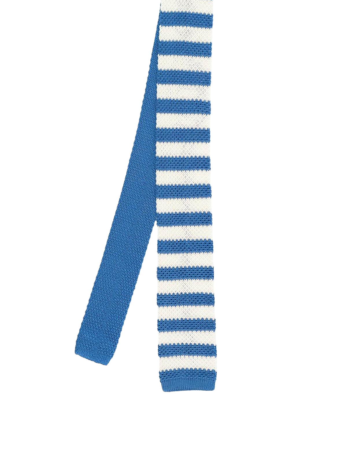 A 1960s inspired skinny tie in high quality knitted silk, featuring bold blue and white horizontal stripes. Handmade in England, this stylish piece is perfect for weddings, garden parties, regattas, or any chic daytime ensemble.