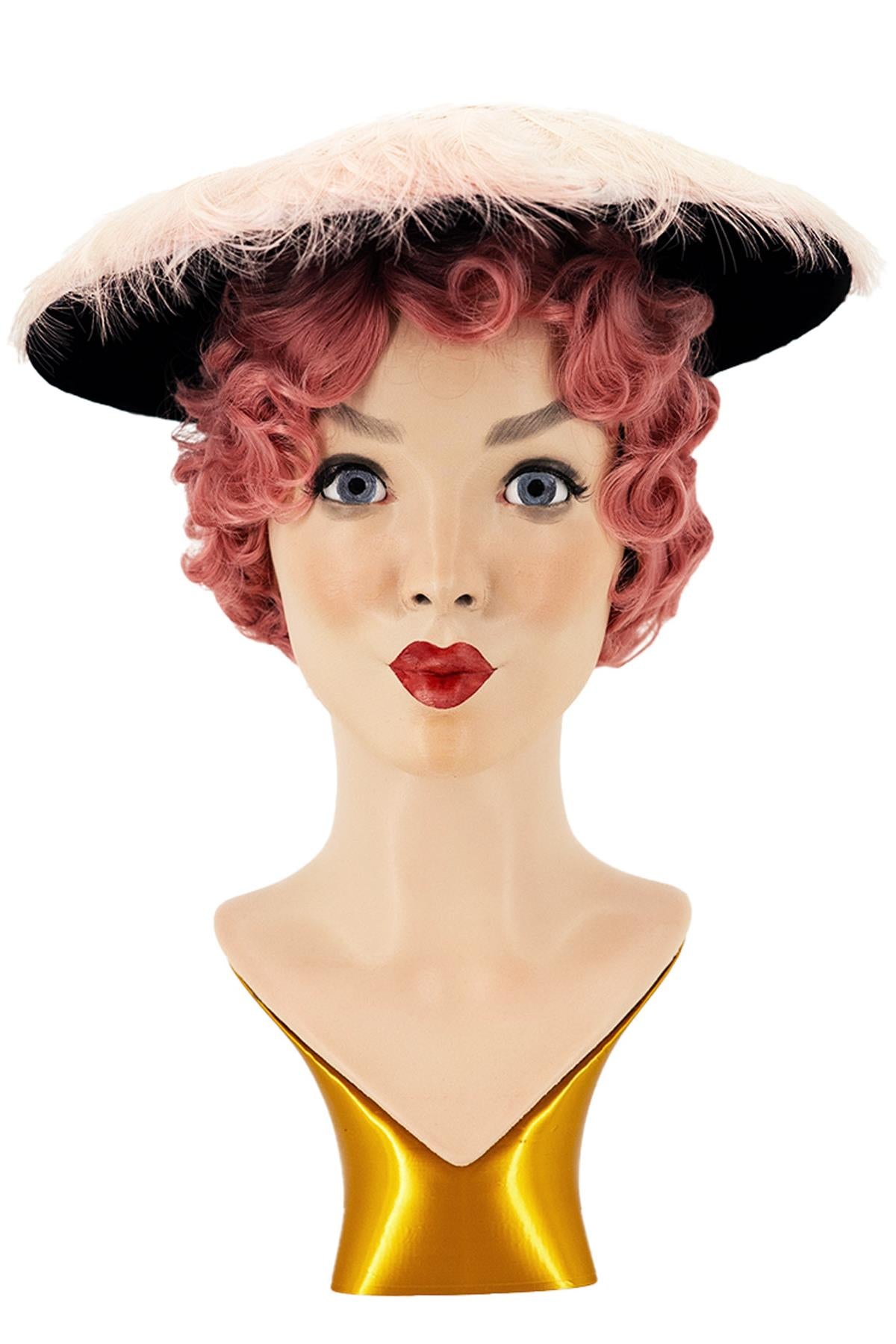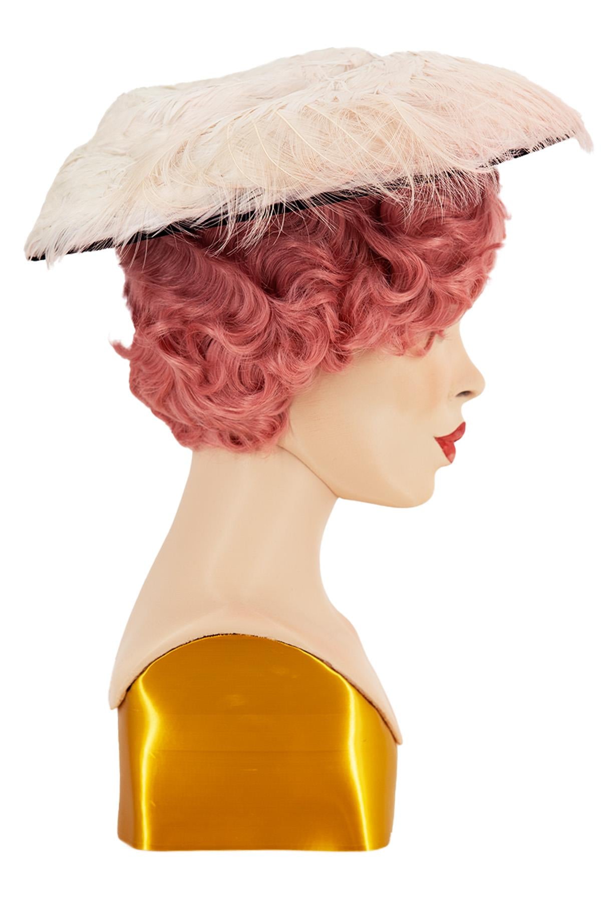 A blush pink feather 1940s hat with black velvet brim in a period saucer shape.