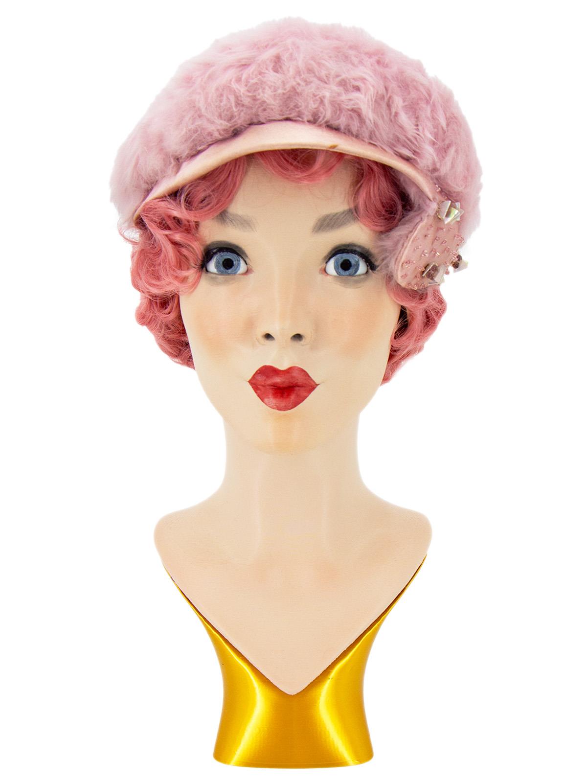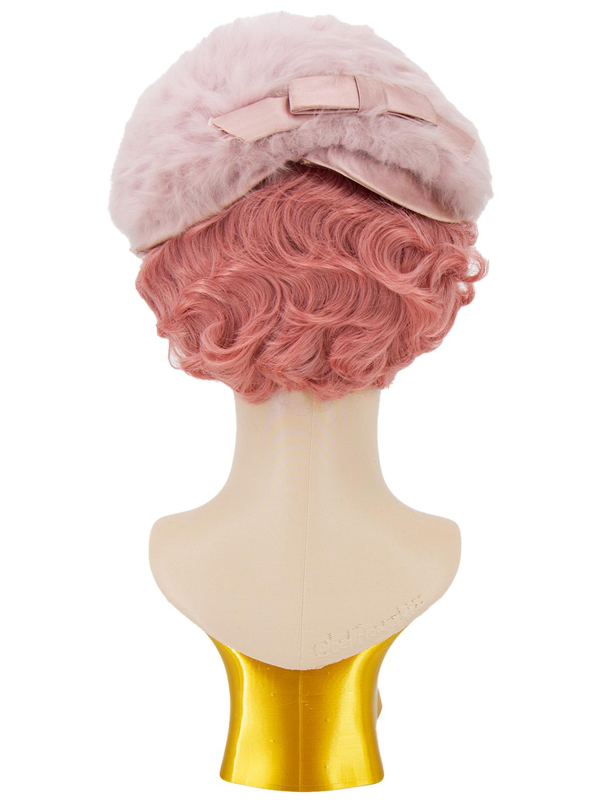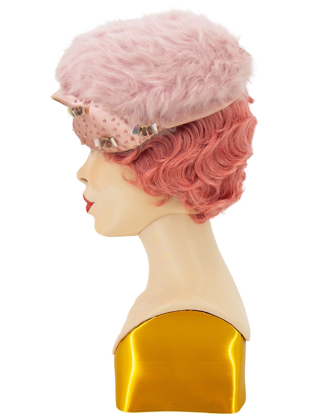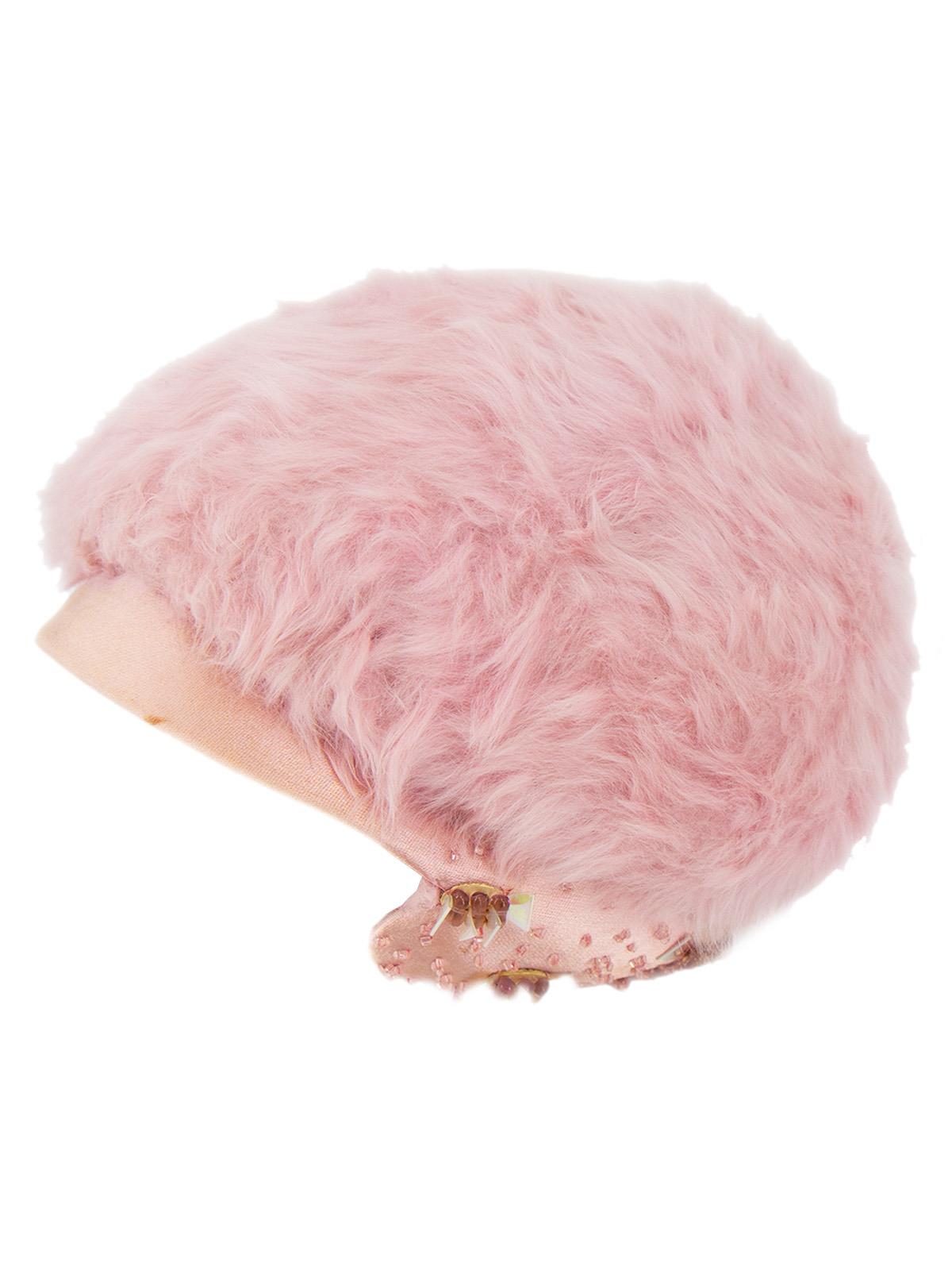 A blush pink fluffy 1950s hat with satin brim, bow, and beaded detailing.