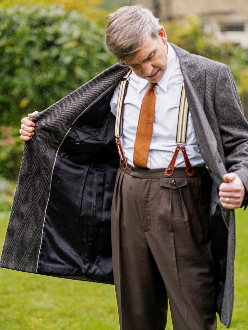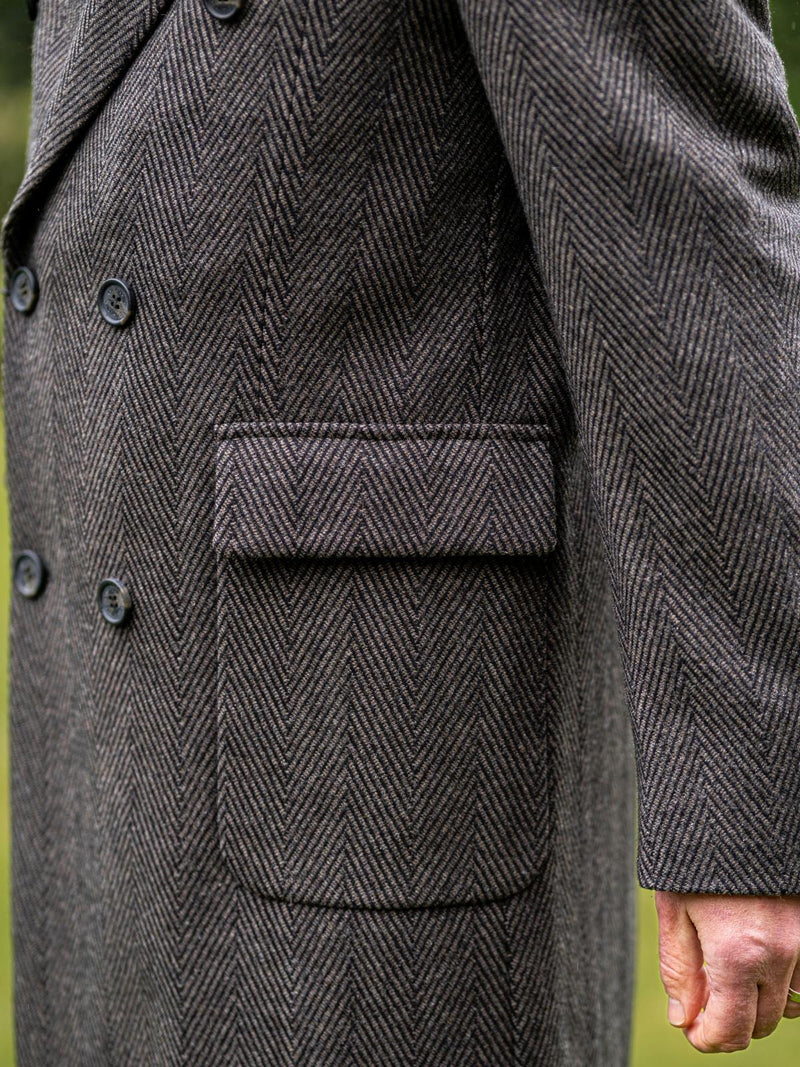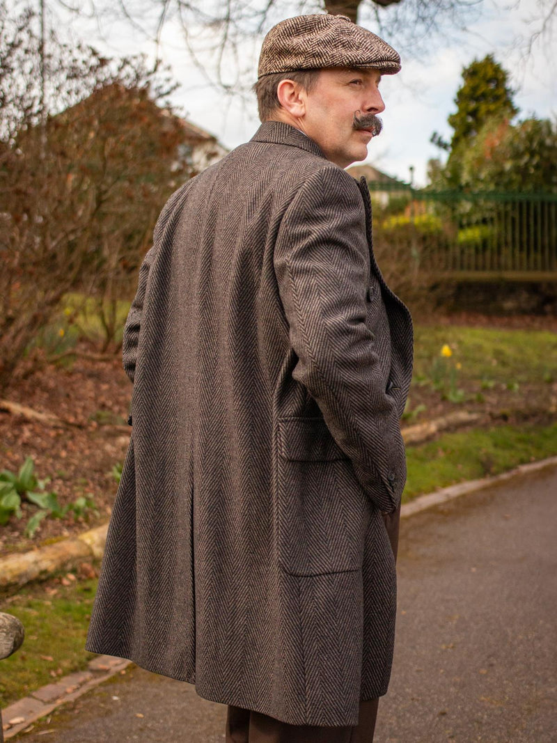 The enduring style of a smart peak lapel collar and a six-button front give this coat a classic look, suitable for a range of midcentury fashions. A high-quality tailored coat is sure to be an enduring piece in any vintage-inspired wardrobe.