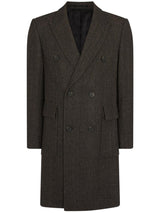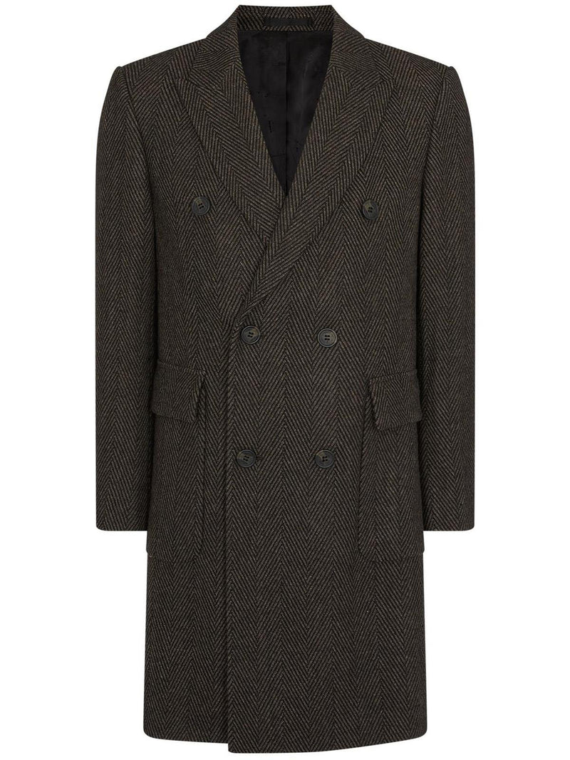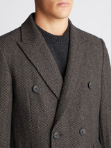 Project sartorial style with this brown double-breasted overcoat from Remus Uomo. Note the peaked lapel, bluff front pockets, and the oversized herringbone weave of the blended wool fabric.