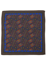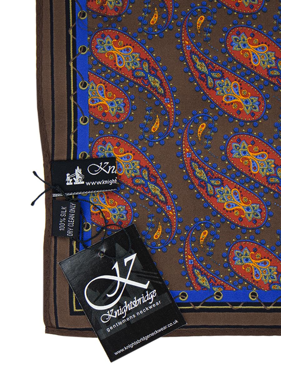 Mens vintage style 100% silk pocket square. A background of chocolate brown with dark red classic paisley pattern and pops of orange and cobalt blue. Matching tie available.