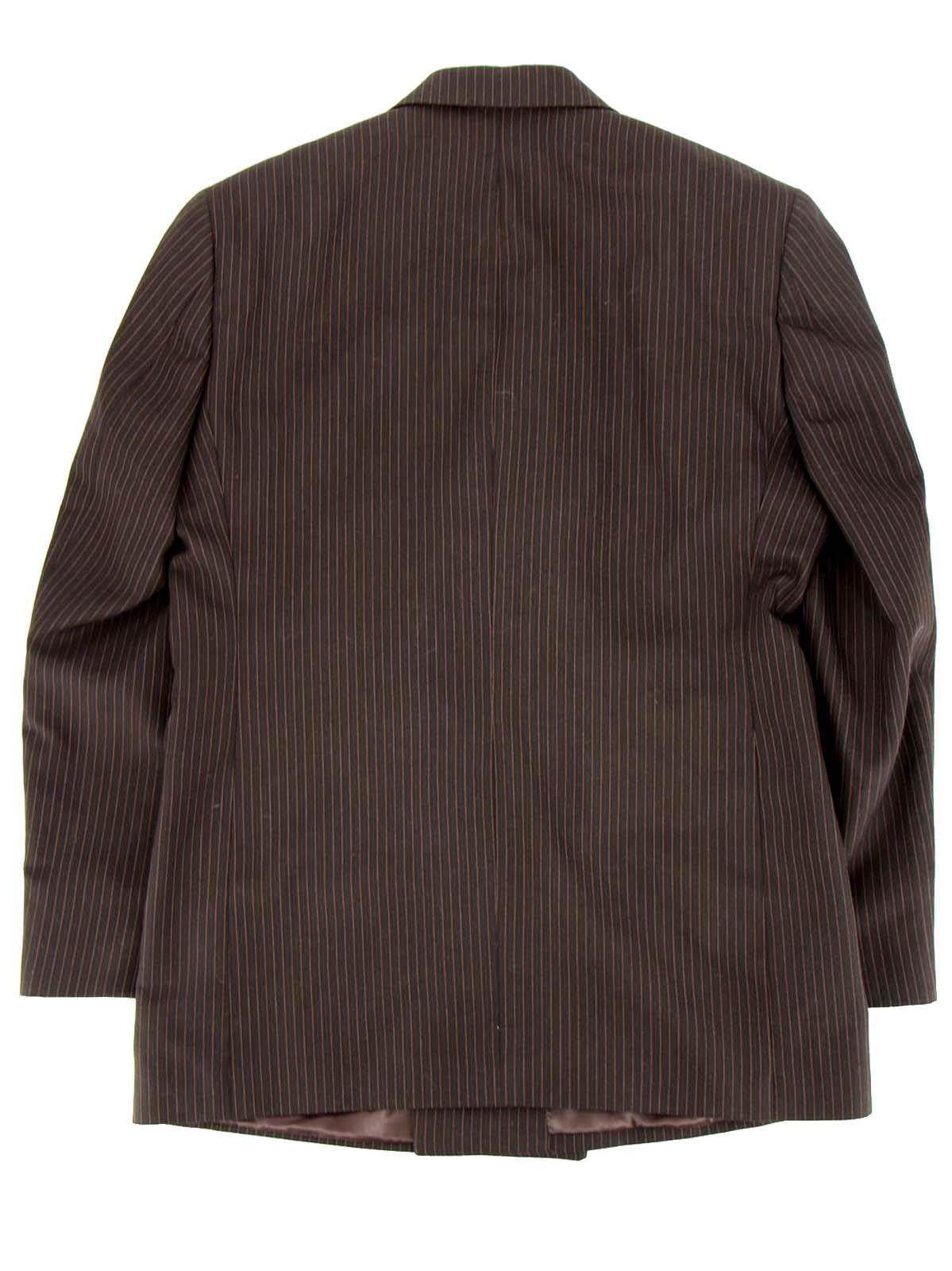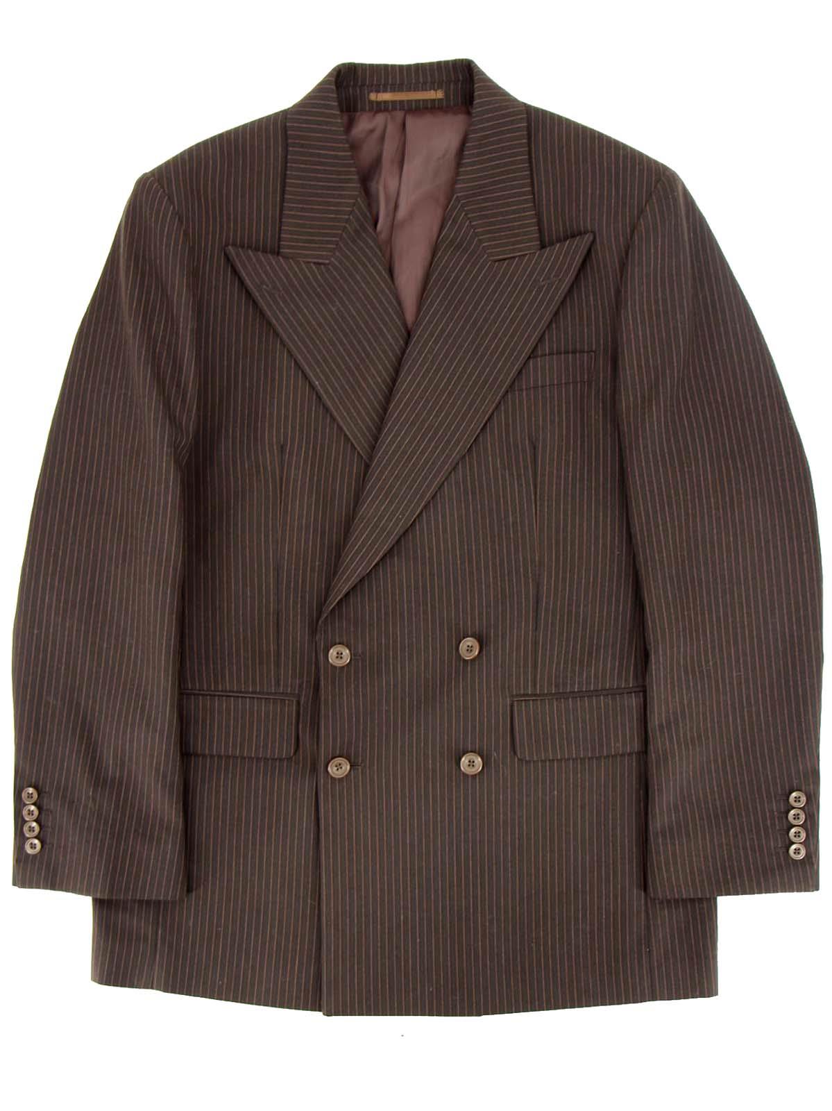 Made of stylish and timeless pure wool brown pinstriped fabric. The suit jacket features charming wide peak lapels and a double-breasted front that cements the post-WW2 style of this piece. The jacket has no back vents, two flap pockets, a breast pocket, and four buttons at each cuff.