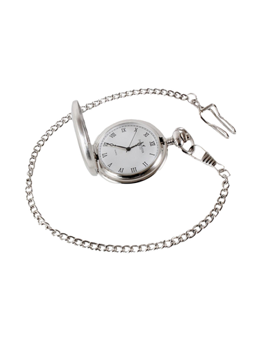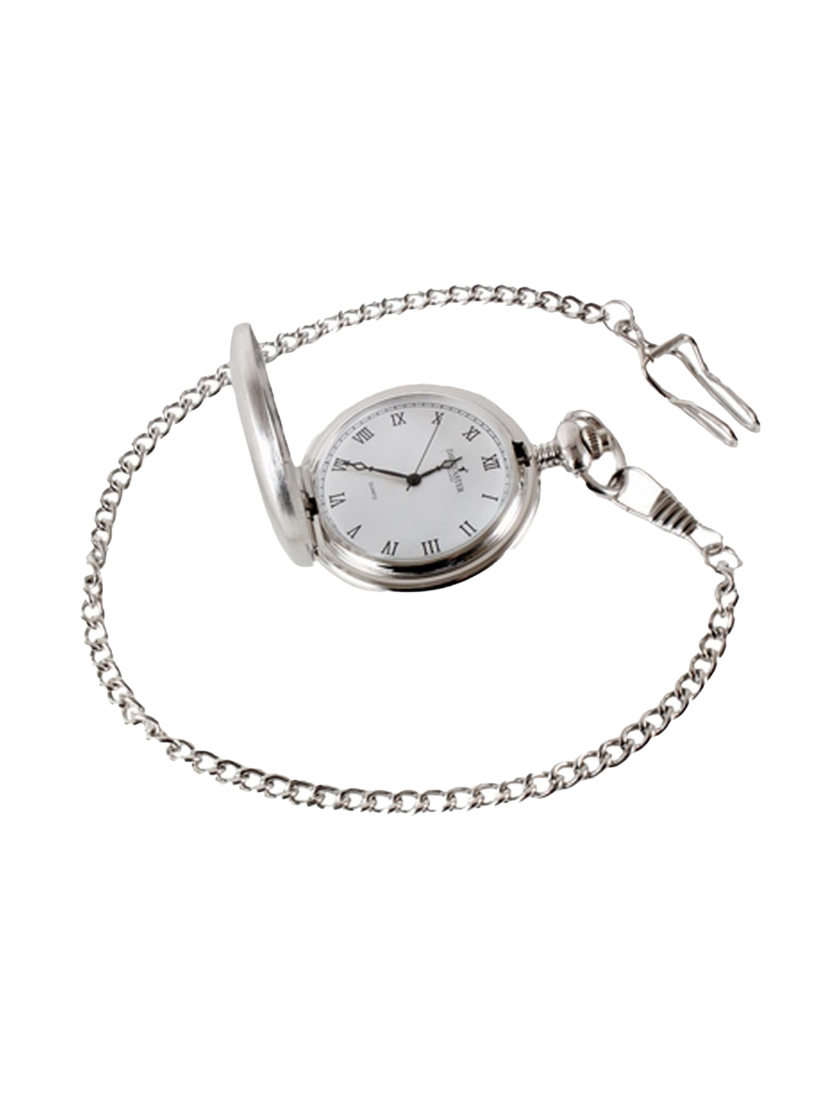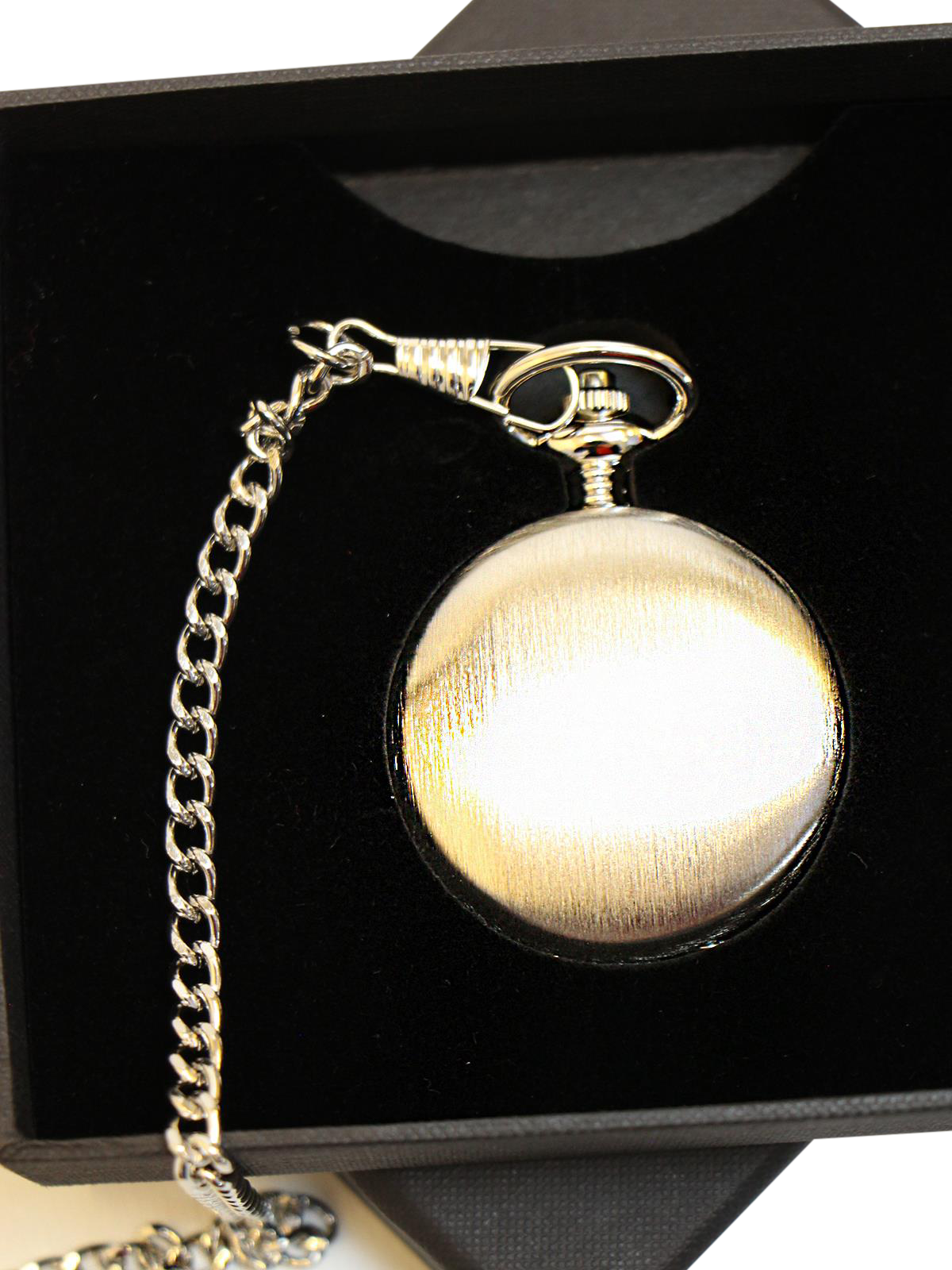 A vintage style brushed silver pocket watch with a flip-front case that reveals an elegant retro timepiece. Finished with a matching silver pocket chain for a timeless gentleman’s accessory.