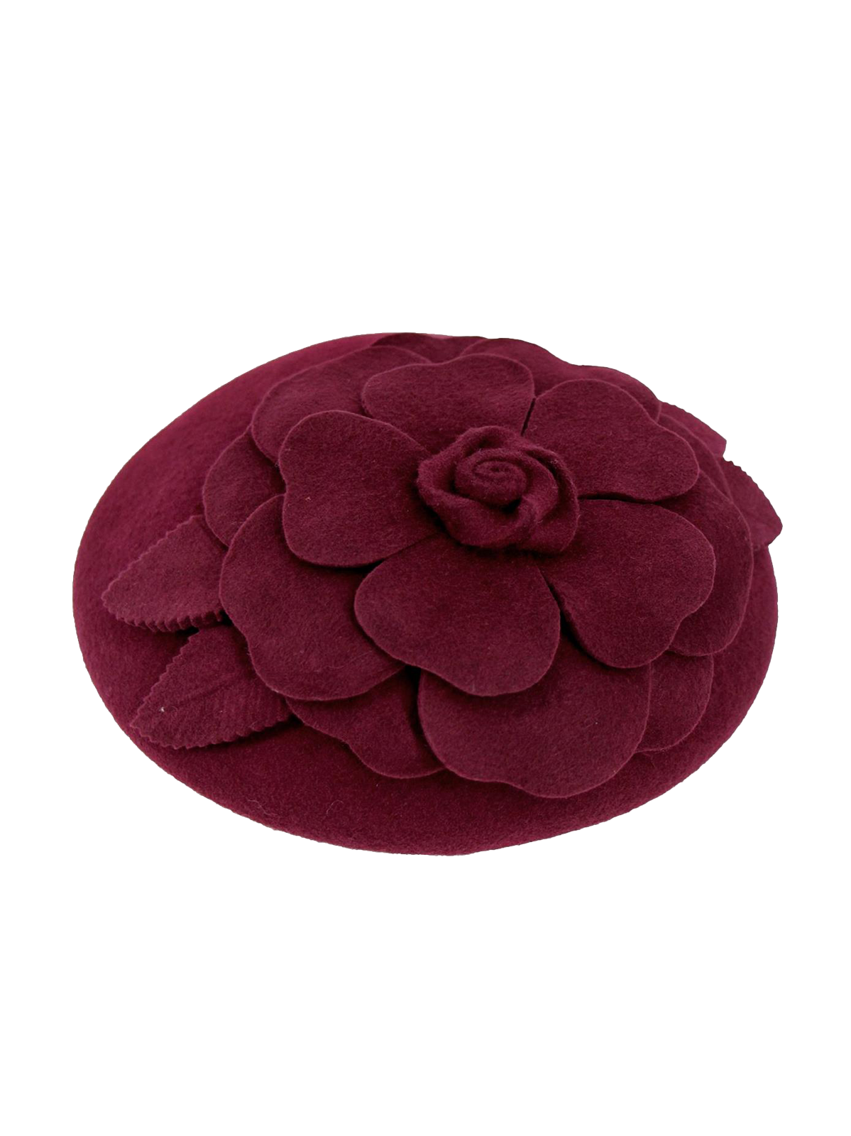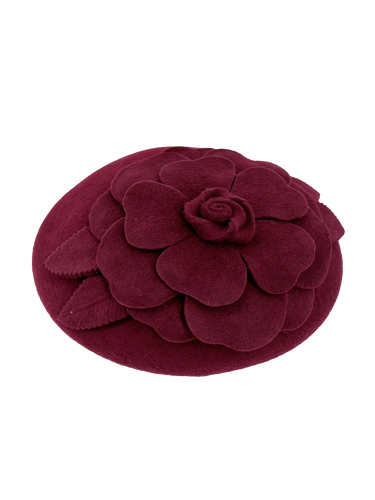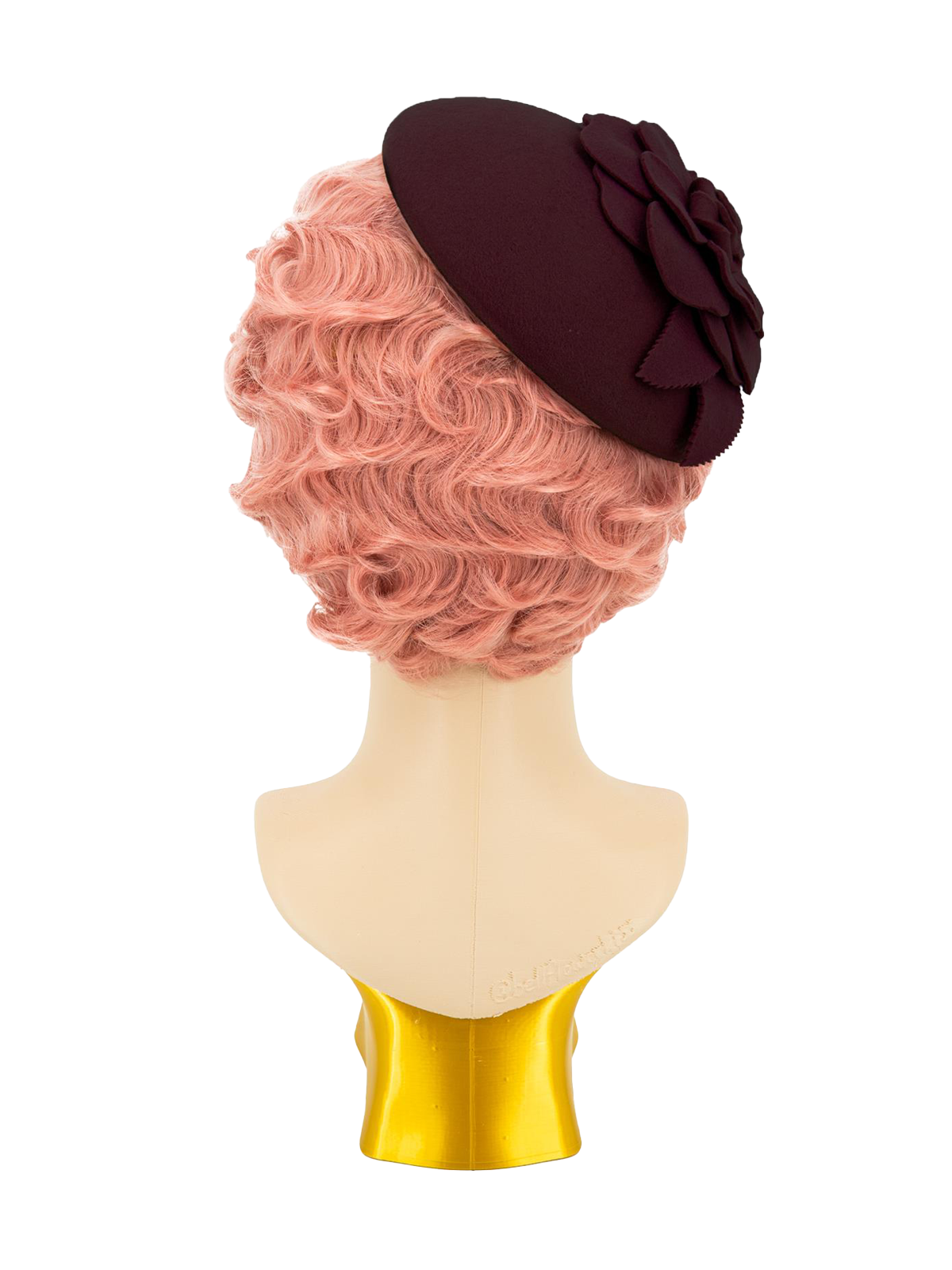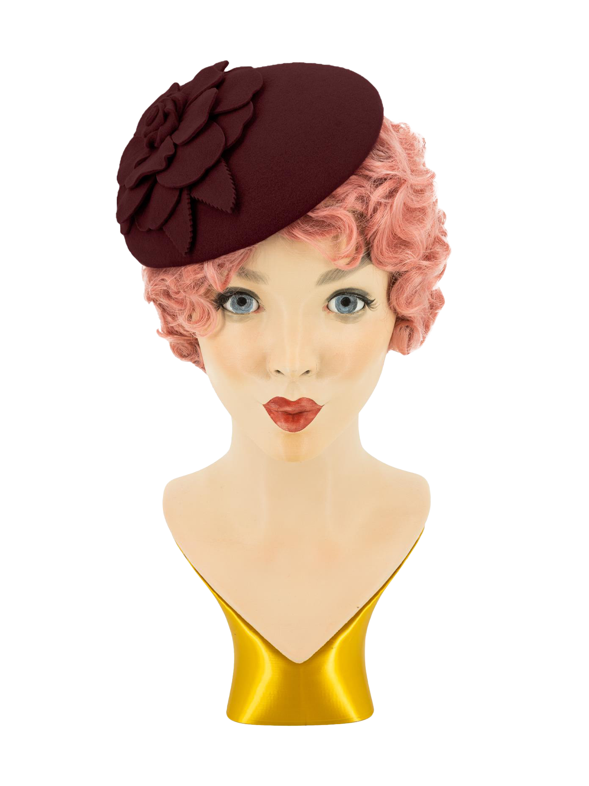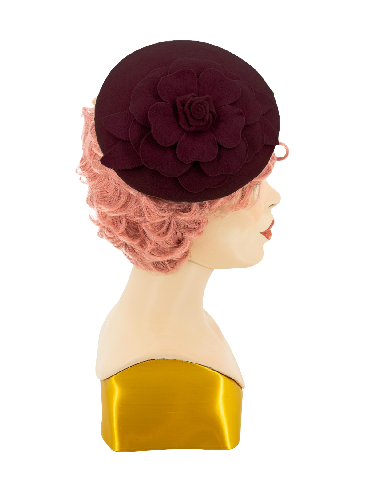 Midcentury vintage style deep burgundy red fascinator hat, with attractive felt flower design.