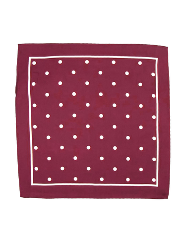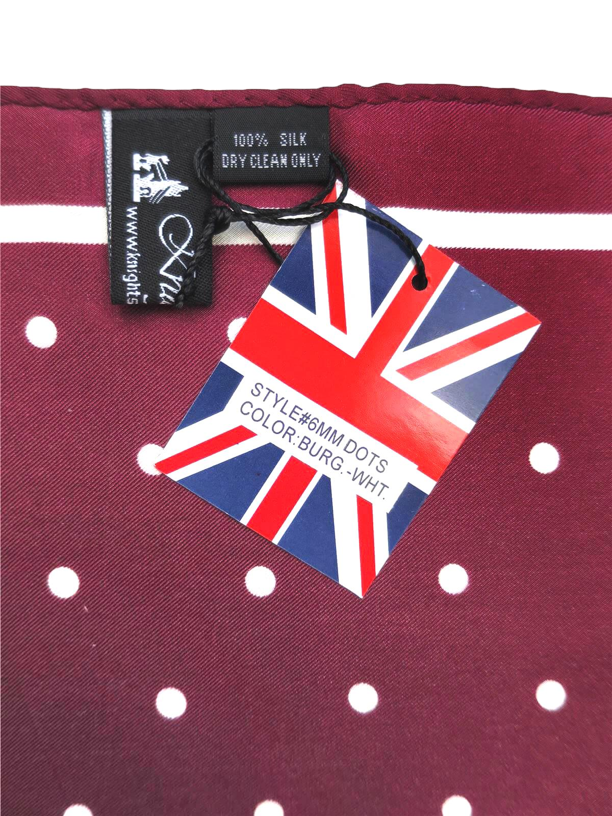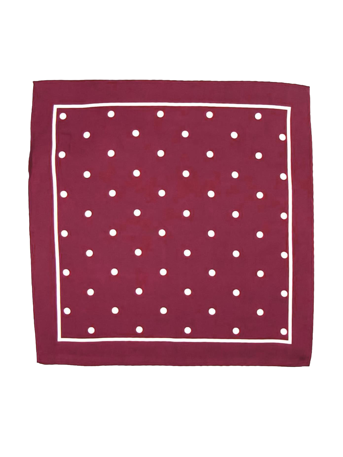 A dark red and white spot pocket square, crafted from 100% pure silk to complement our range of vintage style deluxe silk ties and fringed scarves. A refined finishing touch for any gentleman’s outfit.