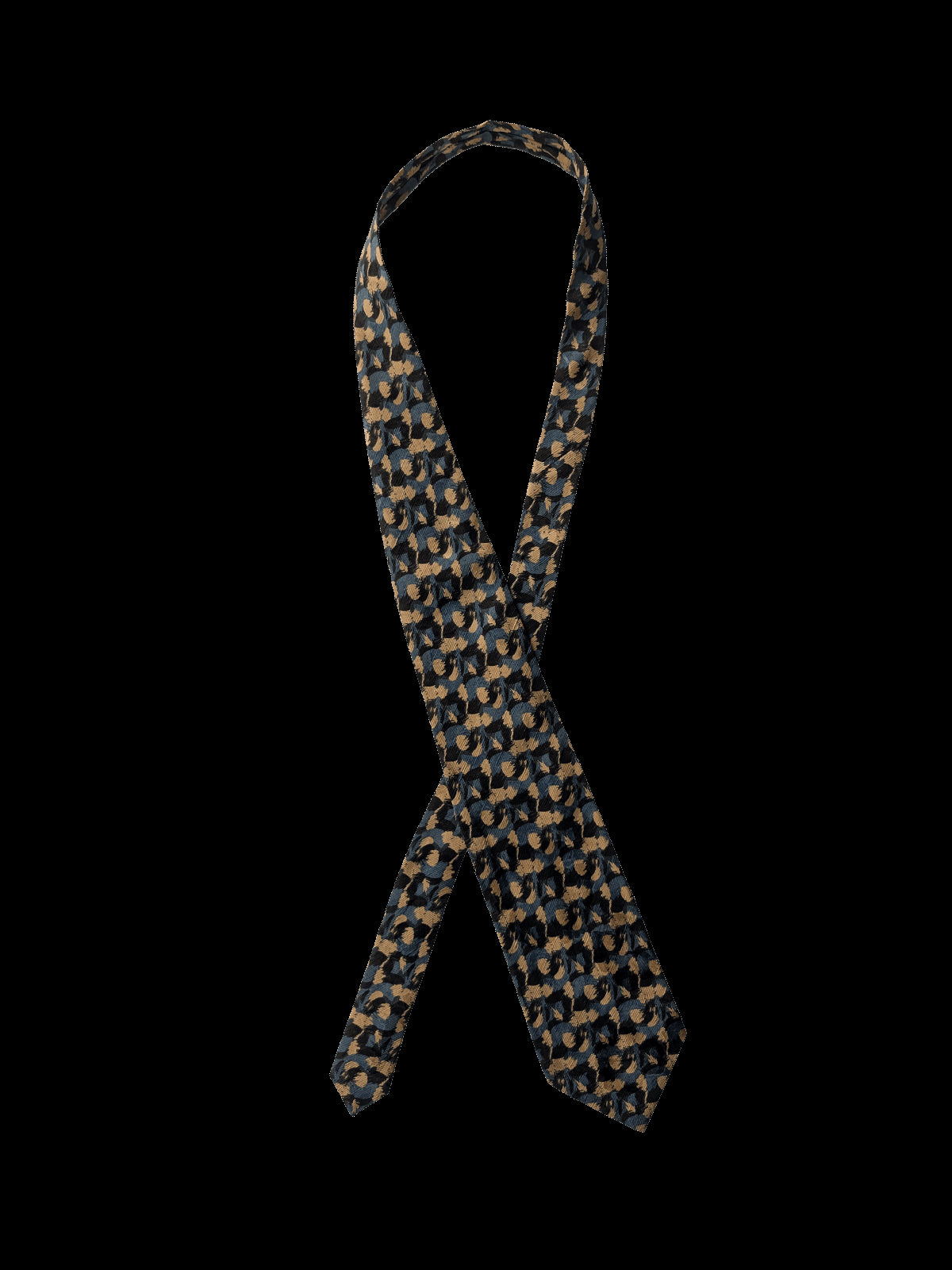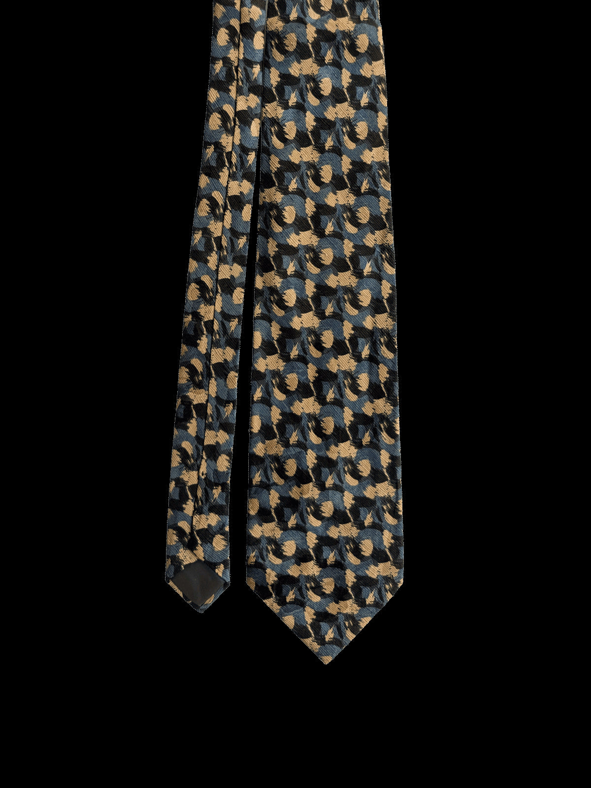 A designer tie with the quality you would expect from Cerruti 1881 label. Highest quality silk in a rich finish. Featuring an abstract repeat design of brushstrokes, in a striking mix of black, blue, and tan/gold shades. A way of adding character to a standard suit and shirt.