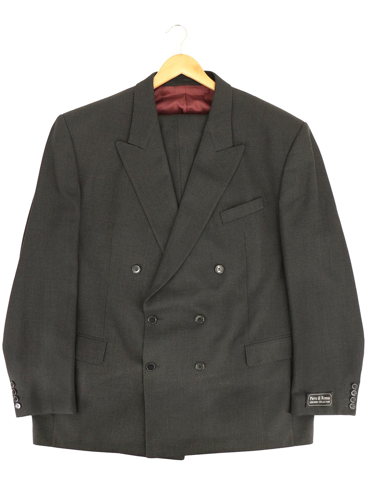 Nineties deadstock suit replicating the characterful 1940s demob suit style in a dark grey and black birdseye pattern. Tailored by Nicholas Rowe for Piero di Roma.