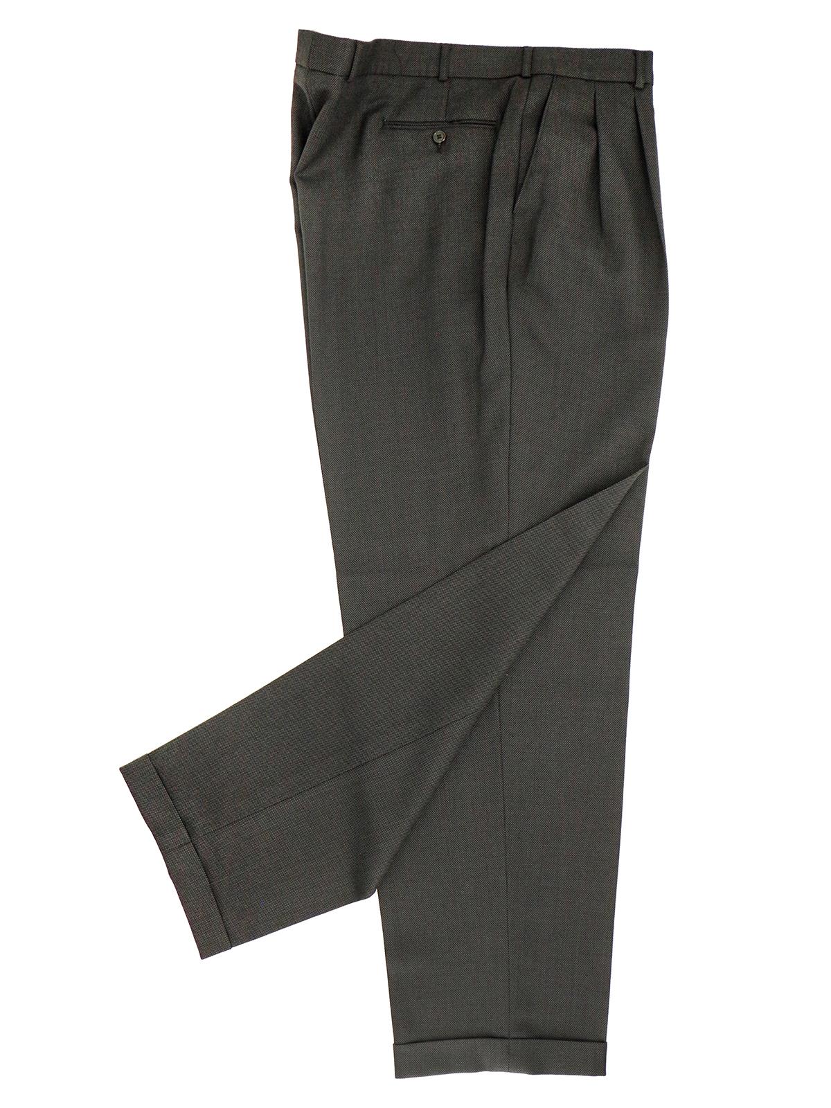 The matching trousers have twin pleats at the front and turn-up cuffs. Two slanted side pockets and a bound pocket with a button at the back.