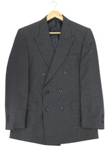 A fine weave wool demob style suit. This brand new, unworn suit, features iconic wide peak lapels, a double-breasted front, and back vents for ease of movement. Fully lined in a complimentary blue with interior pockets.