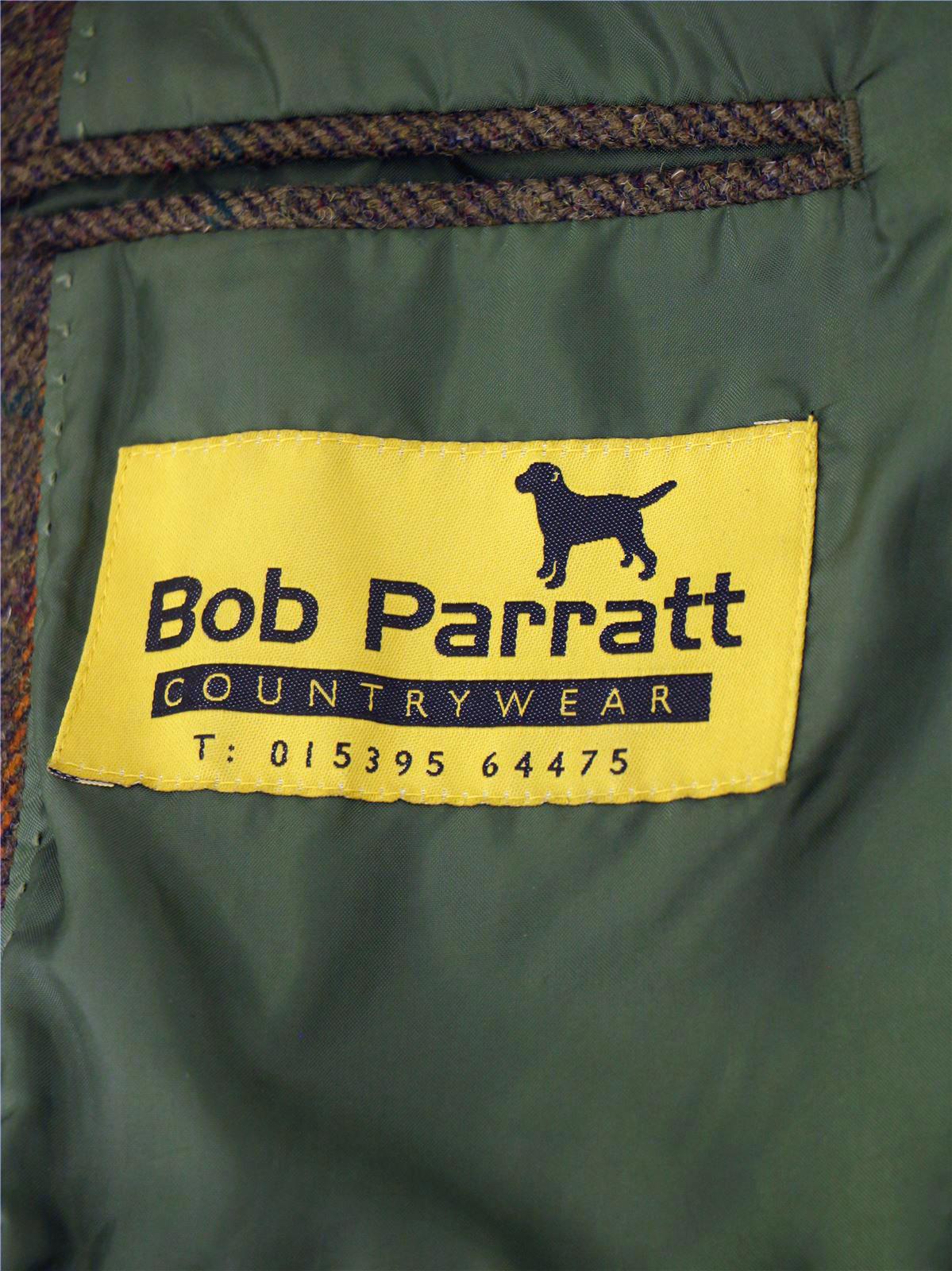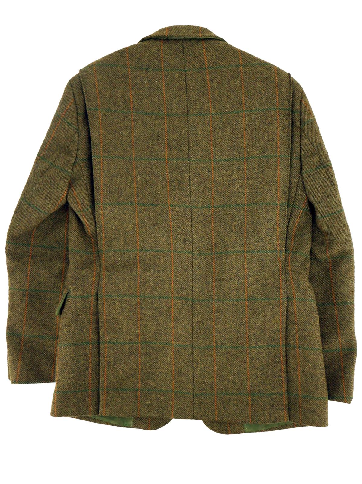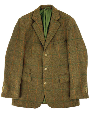 A single-breasted vintage jacket in muted green, with a veridian and orange check pattern.