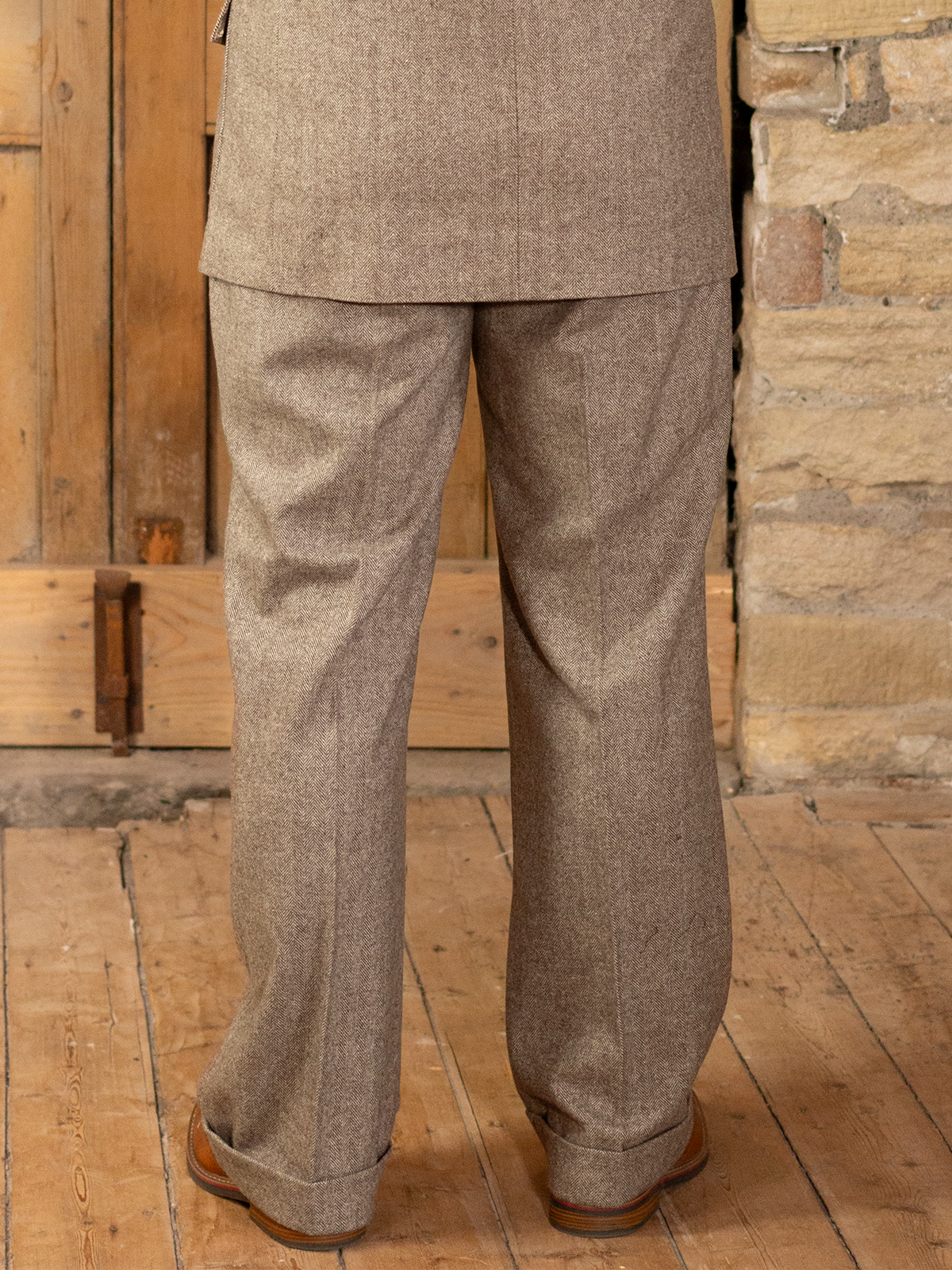 Wool herringbone high waist trousers in a light brown herringbone with fishtail back detail. As always with our Socialite range, we have replicated an original pair of 1940s mens trousers.
