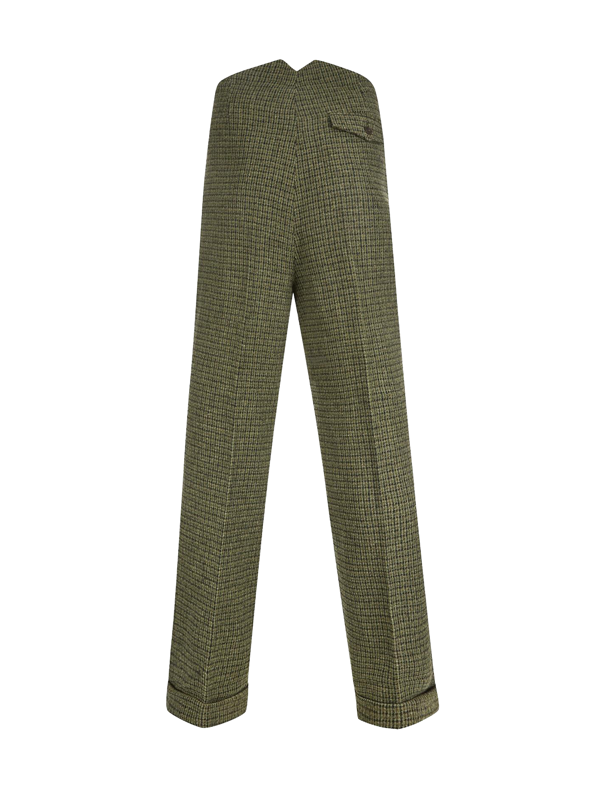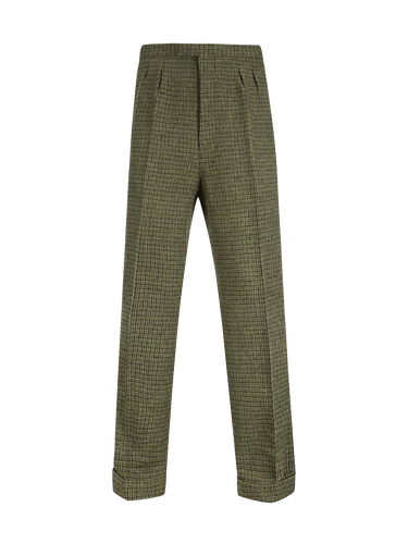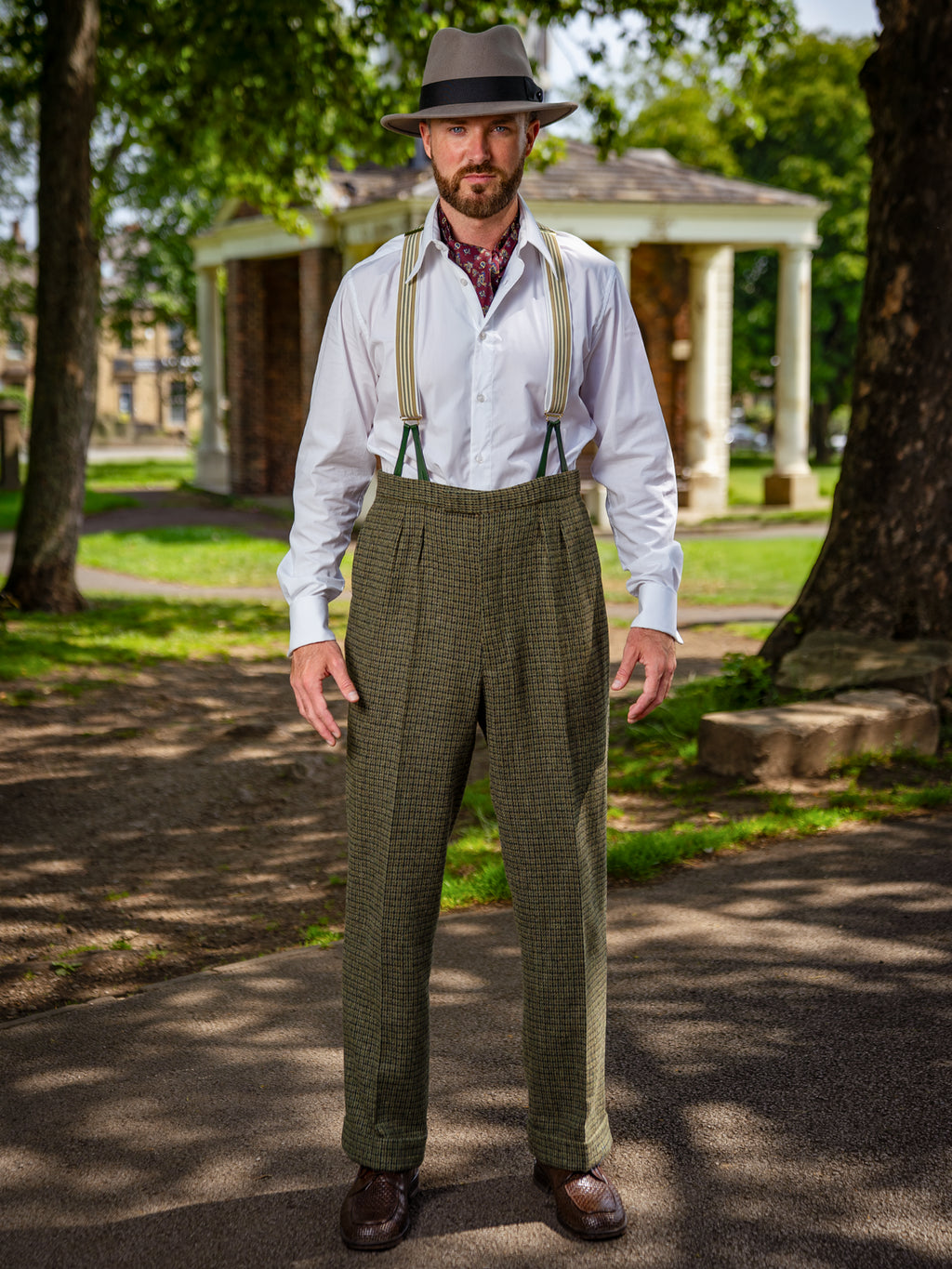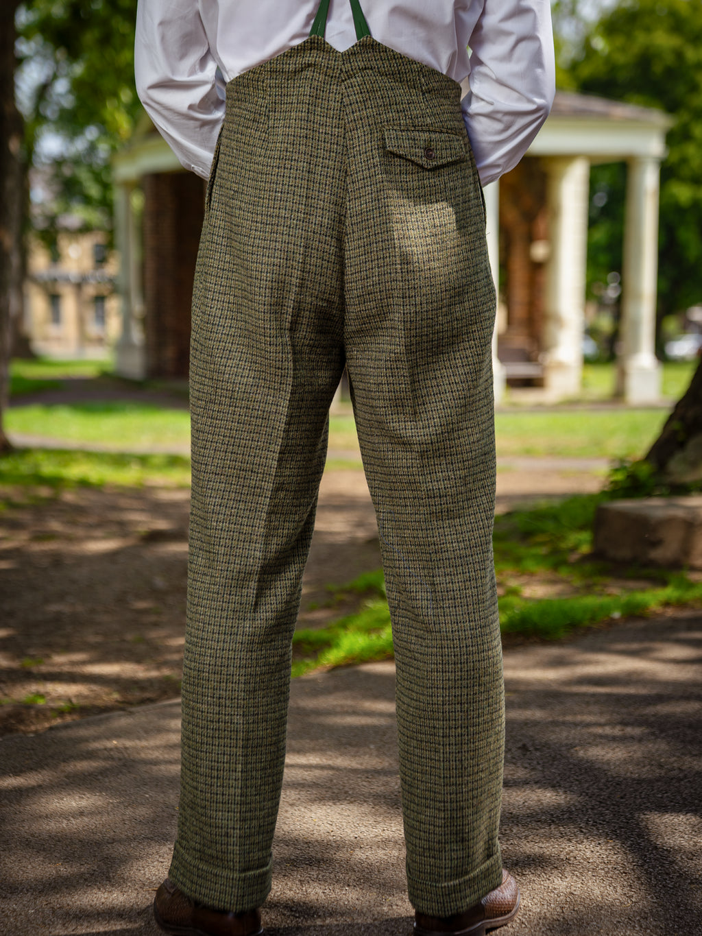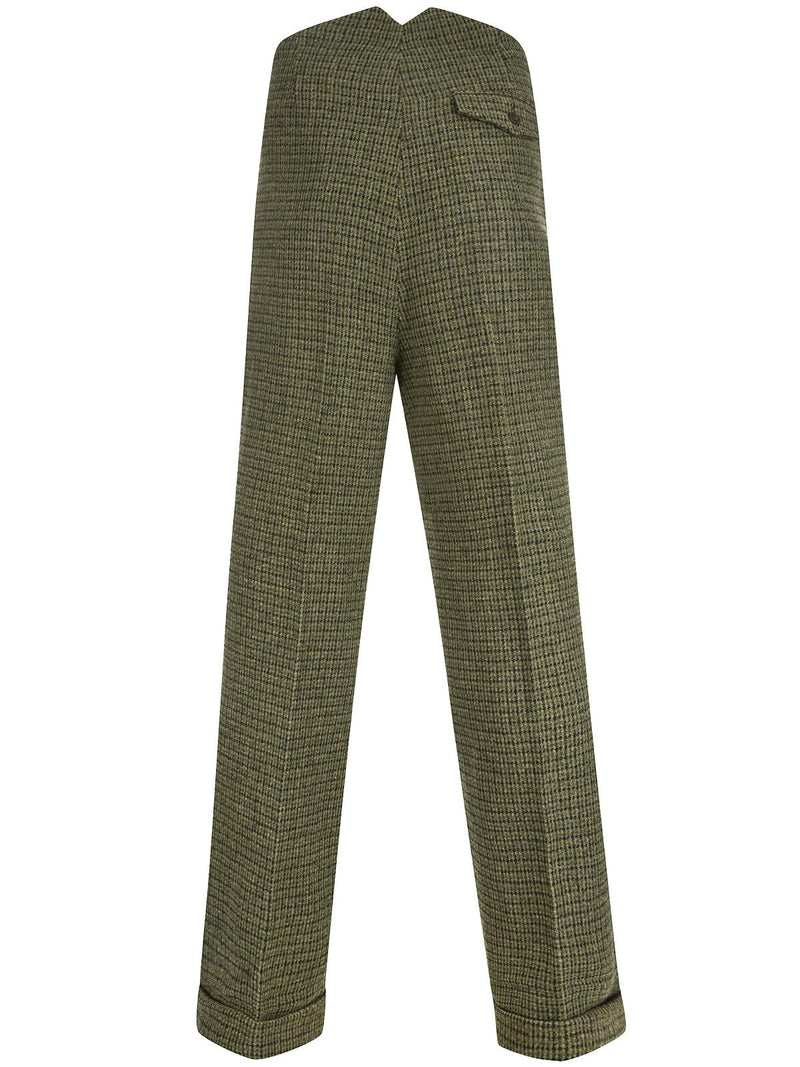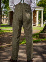 Wool blend high waist trousers in a multi shade green houndstooth tweed with fishtail back detail. As always with our Socialite range, we have replicated an original pair of 1940s mens trousers.