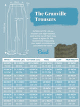 This guide provides waist, inside leg, rise, and hem width measurements for each size. Designed for a high-waisted, vintage-inspired fit with a straight leg silhouette.