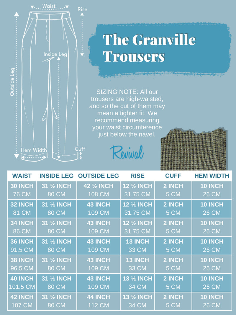 Our trousers are designed to be worn high-waisted, sitting higher on the body than most modern trousers.  If you typically wear a size 34" or larger, we recommend ordering one size up to ensure a comfortable fit.