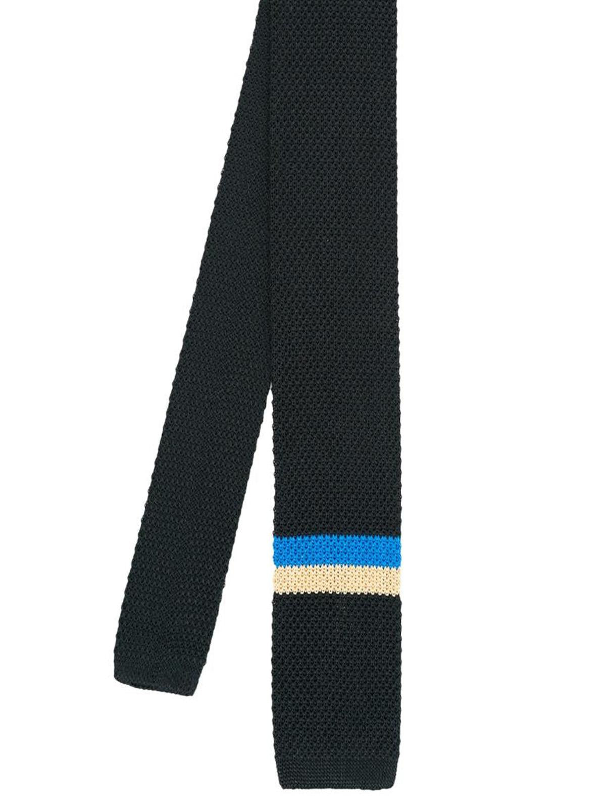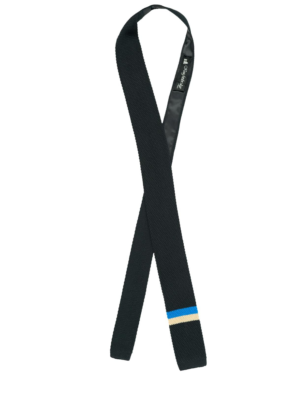 Vintage 1960s look high-quality black knitted 100% silk skinny tie with sky blue and cream horizontal stripe detail.