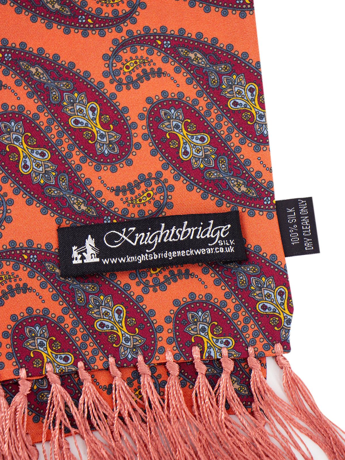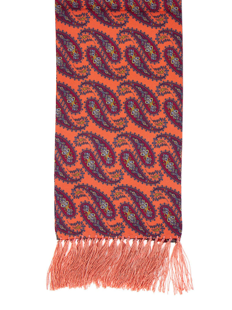 A wonderful coral colour paisley print aviator scarf in 100 % silk. Complemented by wonderful silk tassels and dark red, blue and yellow tones.