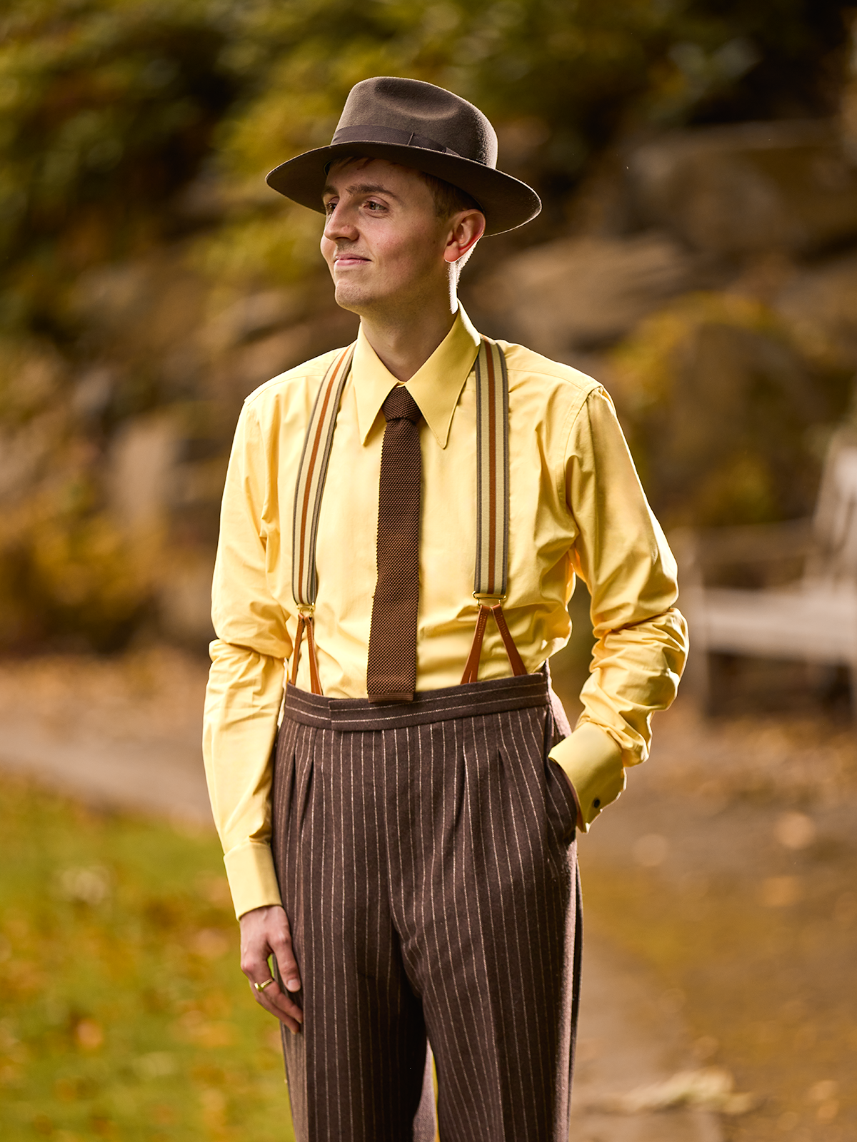 1940s vintage style pure cotton shirt with a spearpoint collar in corn yellow. Classic midcentury shirt style with a soft spearpoint collar.