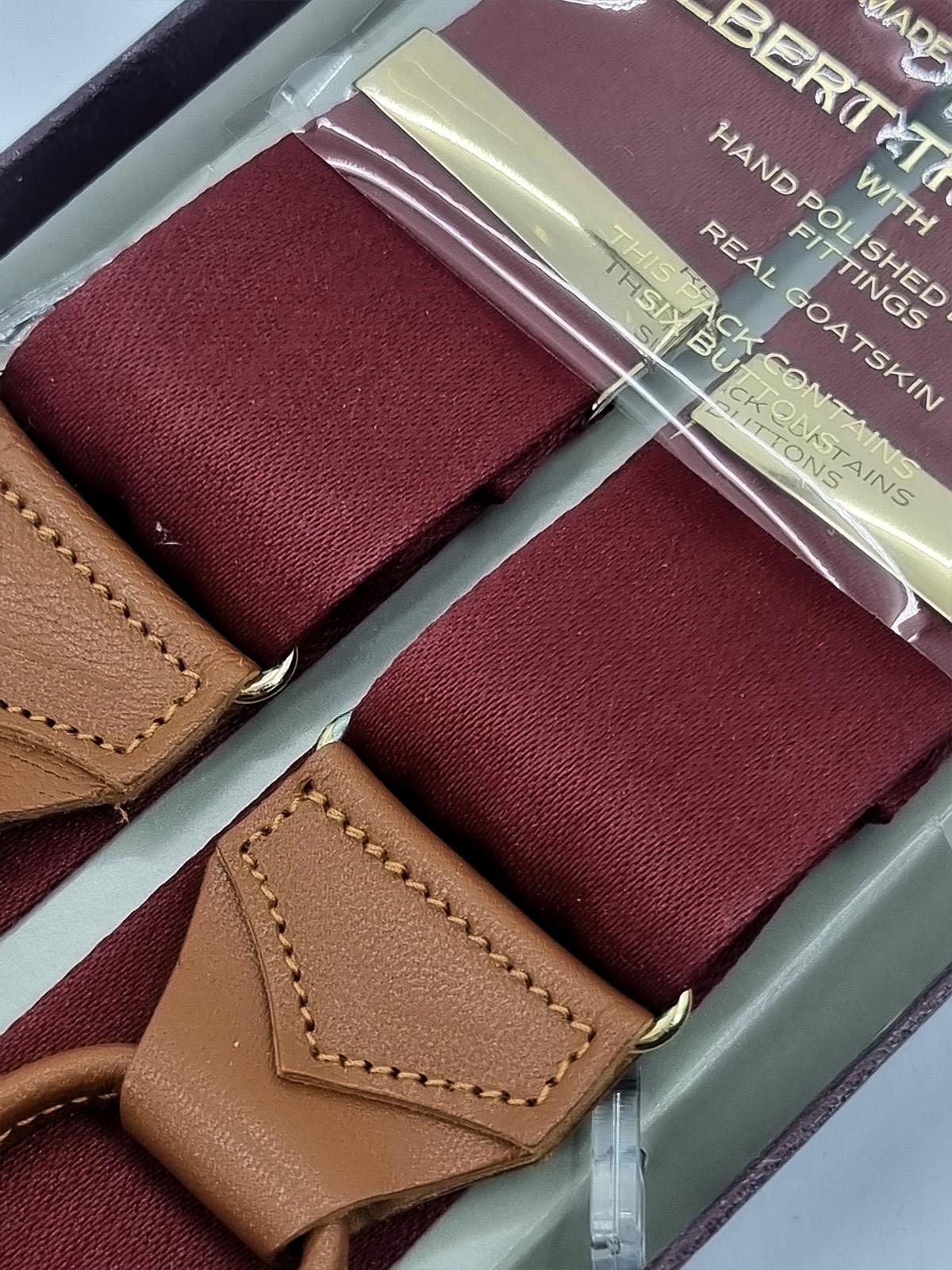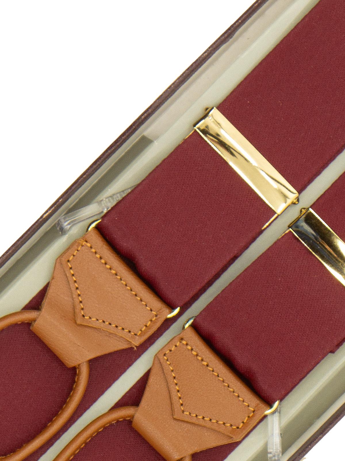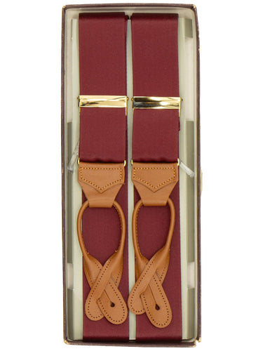 Crimson with tan goat leather loops to attach to trousers with waist buttons.