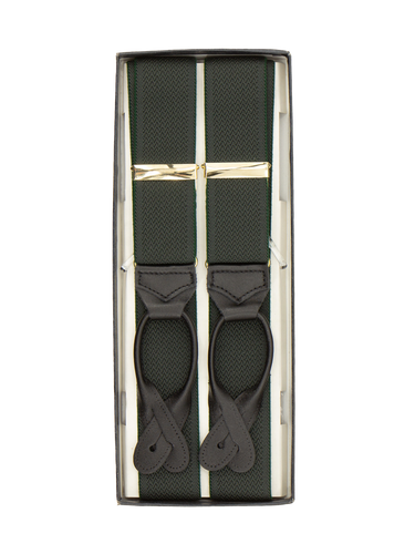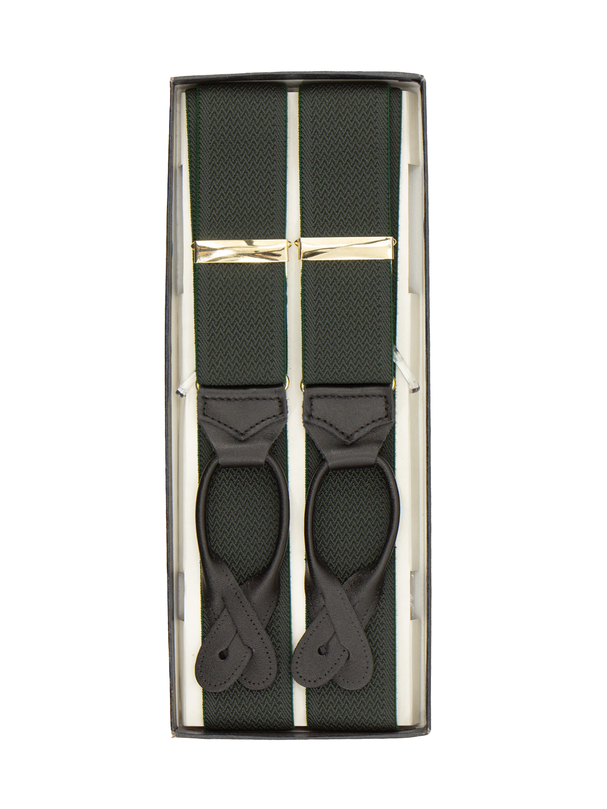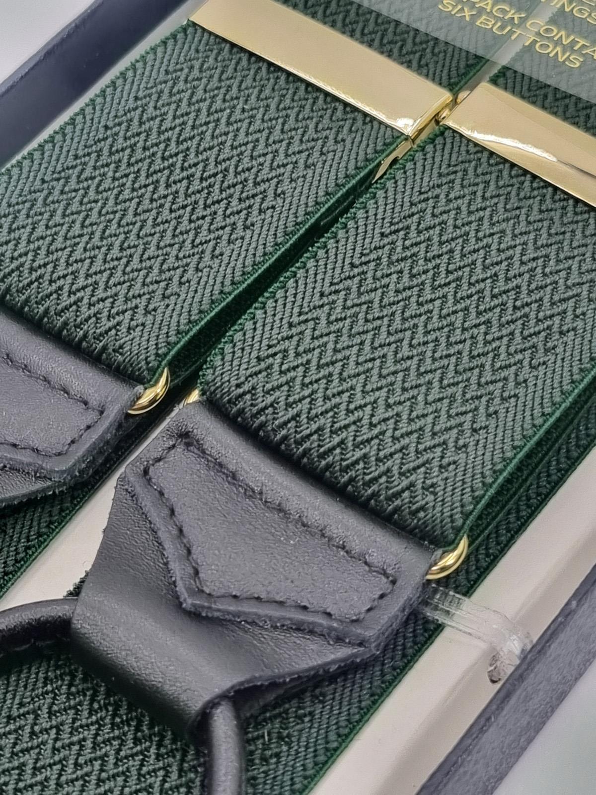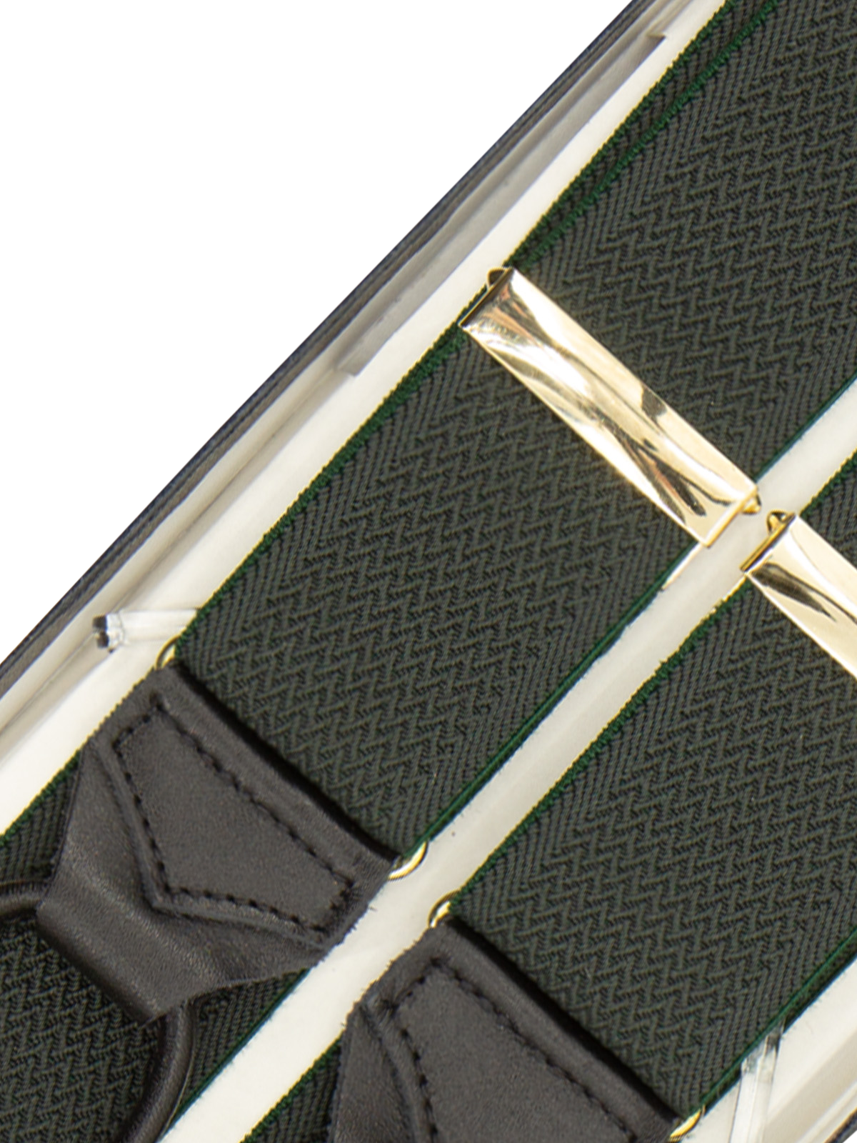 Handcrafted deadstock trouser braces in a distinctive dark green herringbone weave, finished with leather loops for fastening to trouser waist buttons. Expertly handmade and fitted with adjustable brass fittings for a refined, comfortable fit, they feature a classic ‘Y’ back construction.