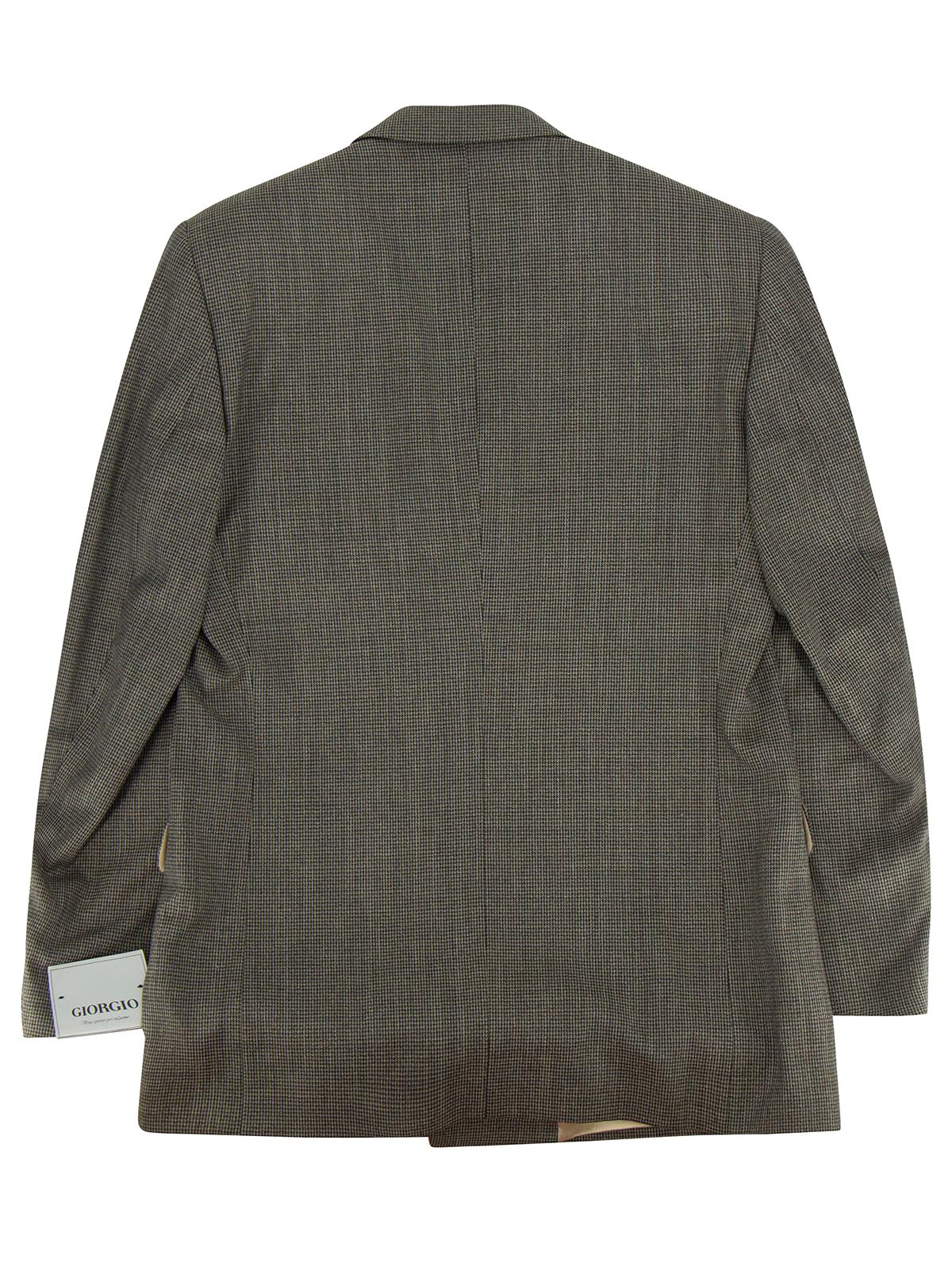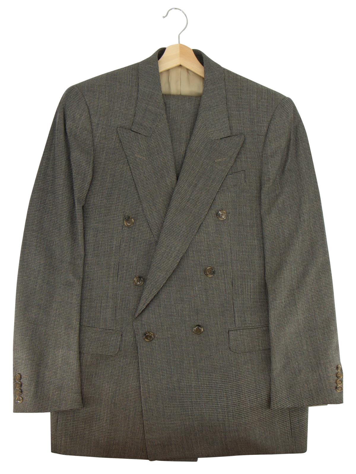 This demob suit is made of a grey poly wool blend with a dogtooth pattern.