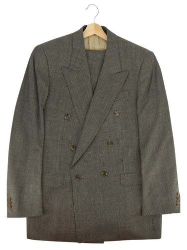 The suit features a classic double-breasted front fastening, with three additional buttons at each cuff, as well as peak lapels, twin flap pockets, and a double back vent.