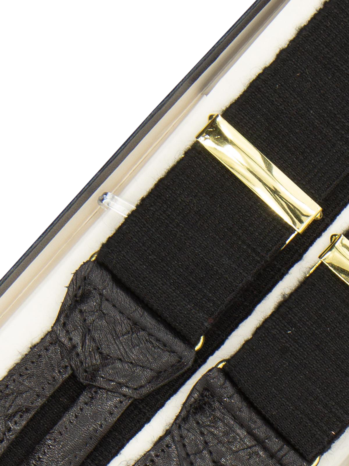 Handmade high quality deadstock trouser braces in black woven fabric, finished with leather loops for attaching to trouser waist buttons. Elasticated for comfort and flexibility, they are adjustable with brass fittings and cut in a classic ‘Y’ back design. Comes with six buttons for securing to trousers.