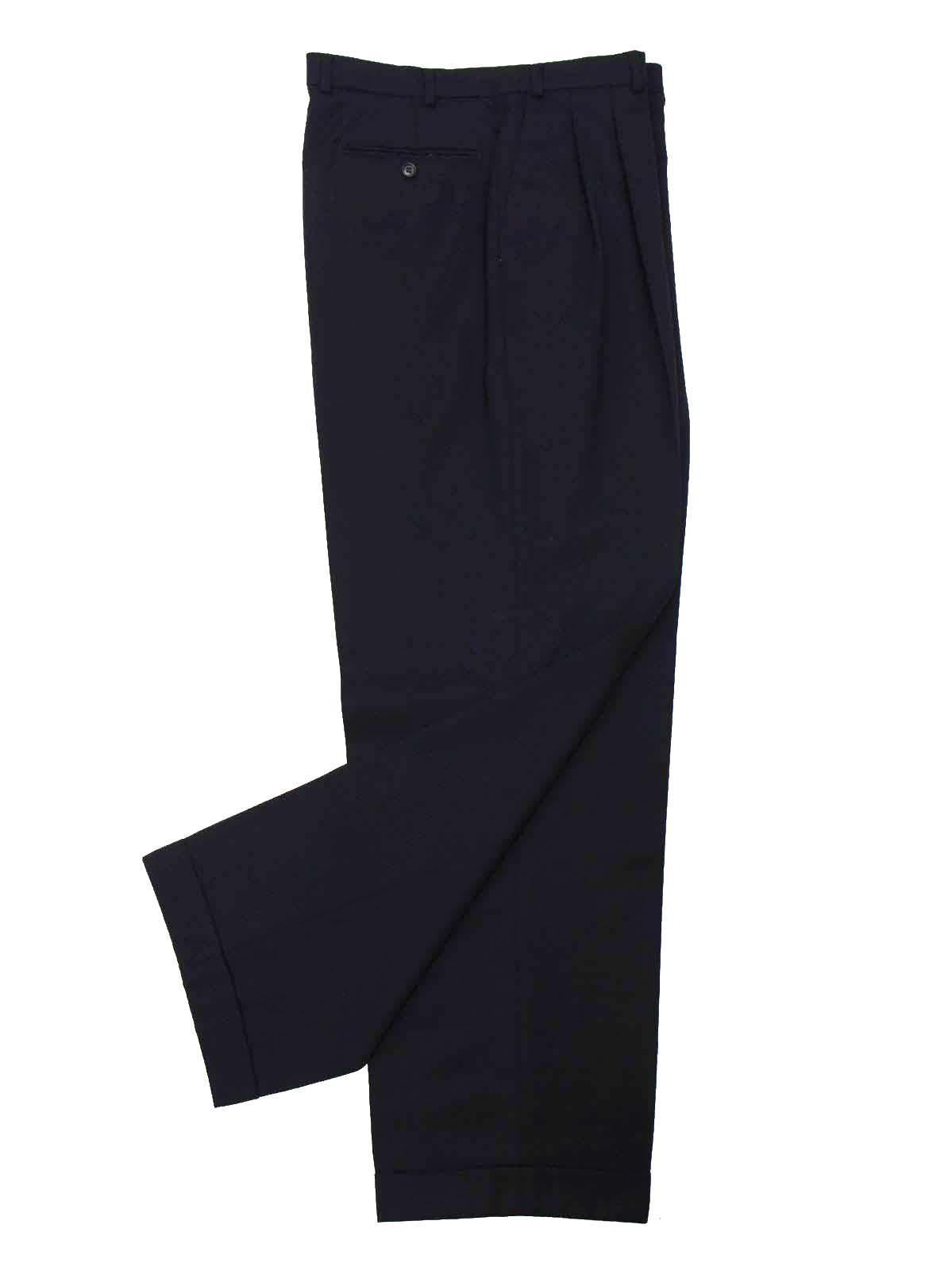 The matching trousers have double pleated fronts and turn-up cuffed hems.