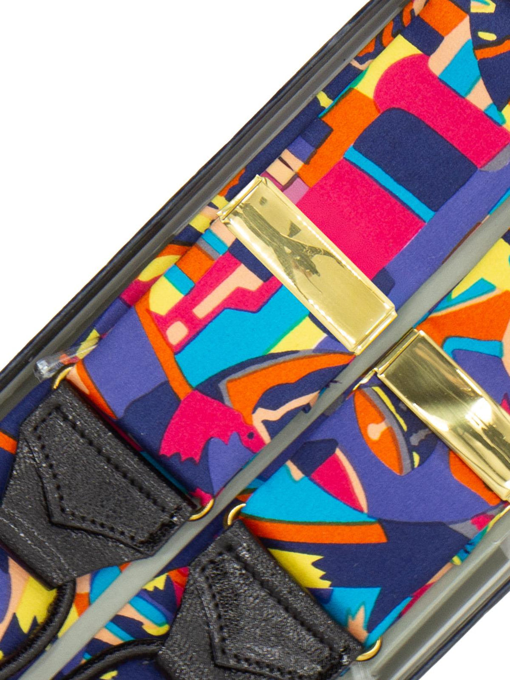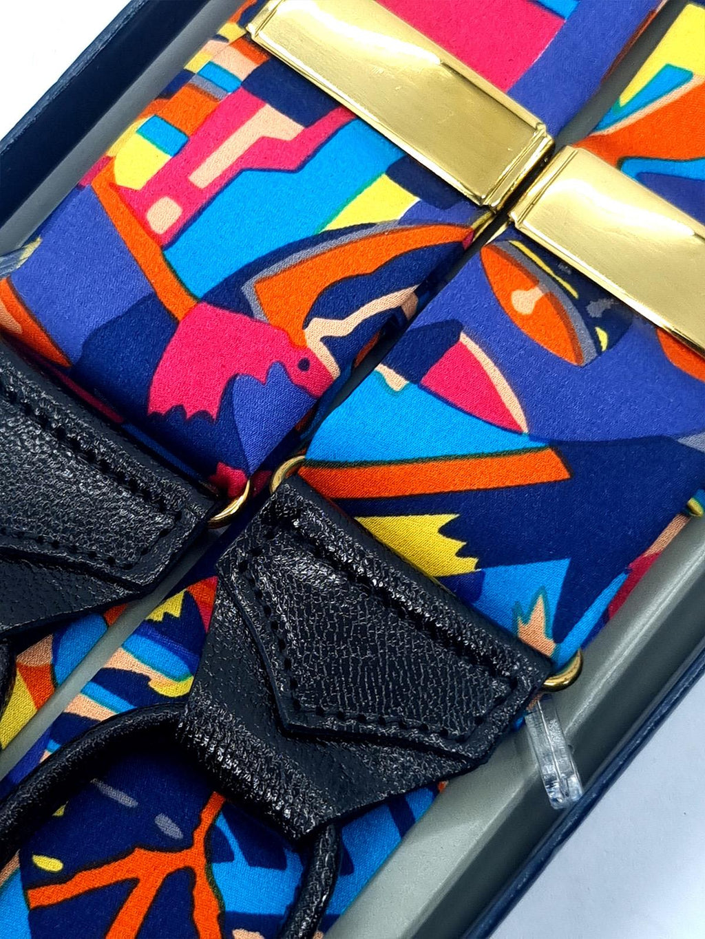 Handmade high quality deadstock trouser braces in a bright multicoloured abstract fabric, finished with polished black leather loops for attaching to trouser waist buttons. Adjustable with brass fittings, they are cut in a traditional ‘Y’ back design and supplied with six buttons for secure fastening.