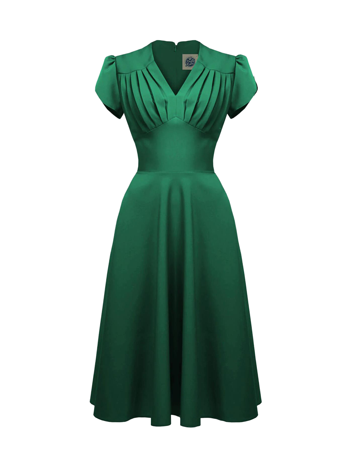 The fit on this dress creates a classic vintage 40s/50s silhouette. Pleated above and below the bust with waist panel to create a further 'nipped in' look. The 3 quarter full skirt gives a full sweep and petal cap sleeves do not restrict the arms.